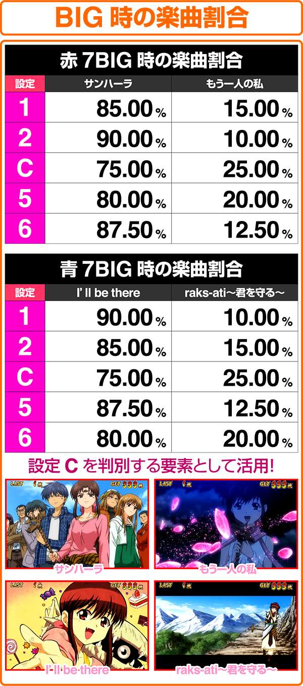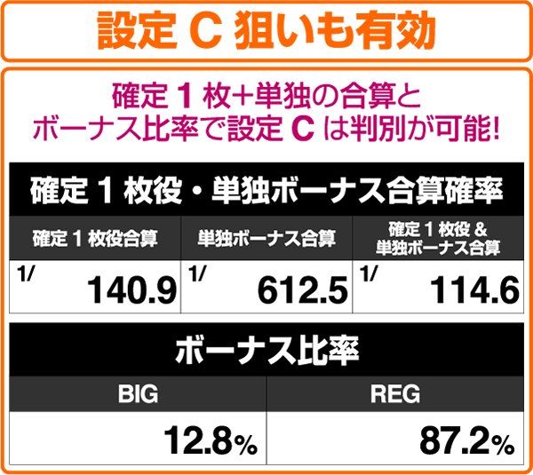 設定Cは小役の獲得やボーナス中の技術介入要素をすべて実行できれば、機械割は設定6と大差ない数値となるだけに要チェック。より効果的に判別をおこなうならば、REG比率およびREG確率に注視したい。