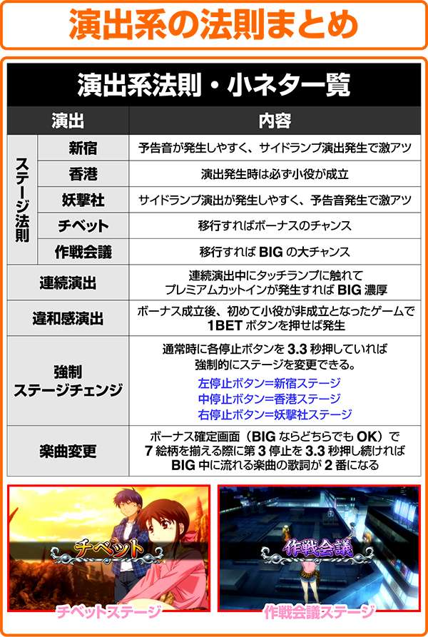 設定Cの高い技術介入要素に加え、リール制御、ステージ毎の法則、演出の組み合わせで変則押しが面白いパターンが多数。 また、Cならではの判別スピードも魅力の一つ。
