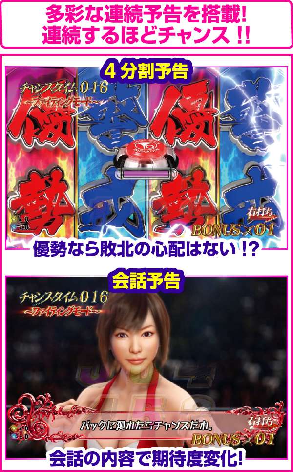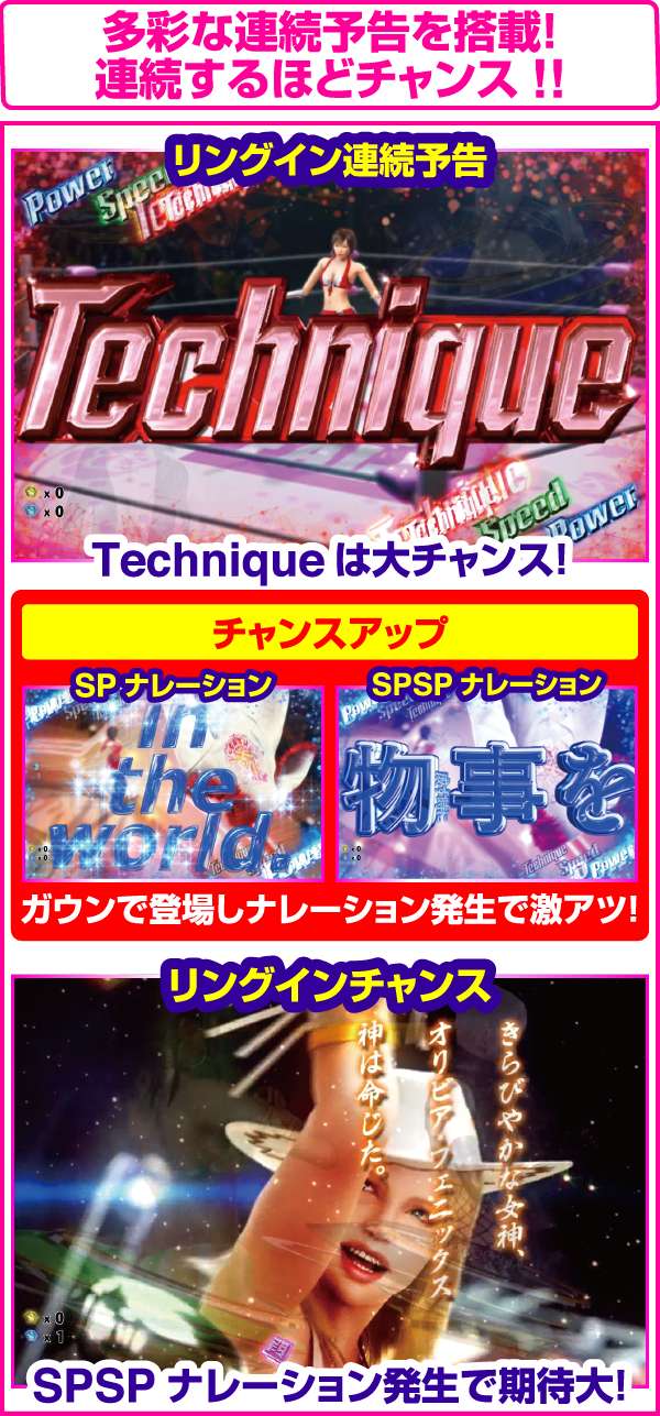 リングイン連続予告とリングインチャンス、ロードワーク背景専用となる3Dキャラ連続は、ナレーションが発生すれば期待度が大幅にアップする。