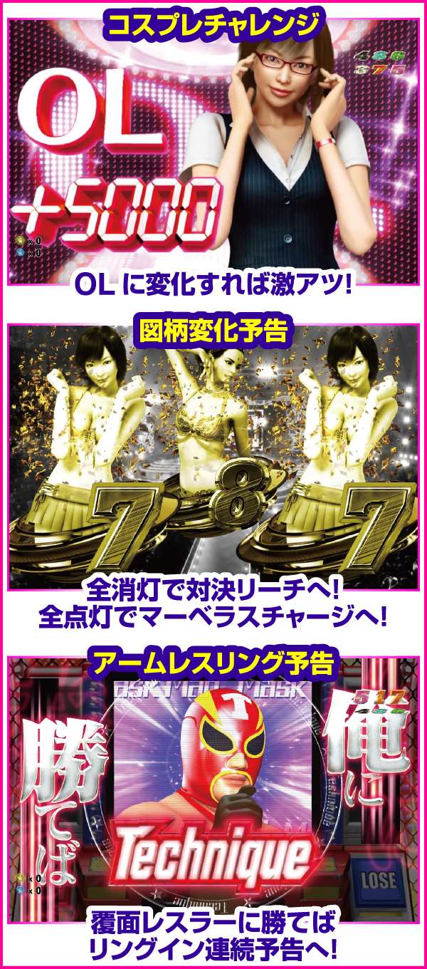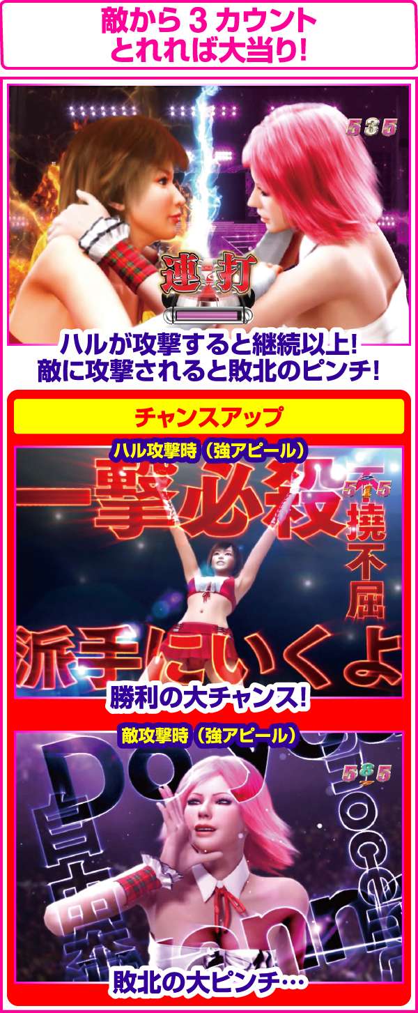 3年半の沈黙を破り桜木ハルが再びリングに戻ってきた! スペックはV確変+転落と前作を踏襲していて、ドキドキ感は健在しているぞ。 新キャラ「デイジー」と「セダ」が参戦で、よりセクシー&エキサイティングなバトルに注目だ!! 兄弟機は甘デジのほかに、ミドルとライトミドルが用意されていて、好みに合わせてチョイスしよう。 |