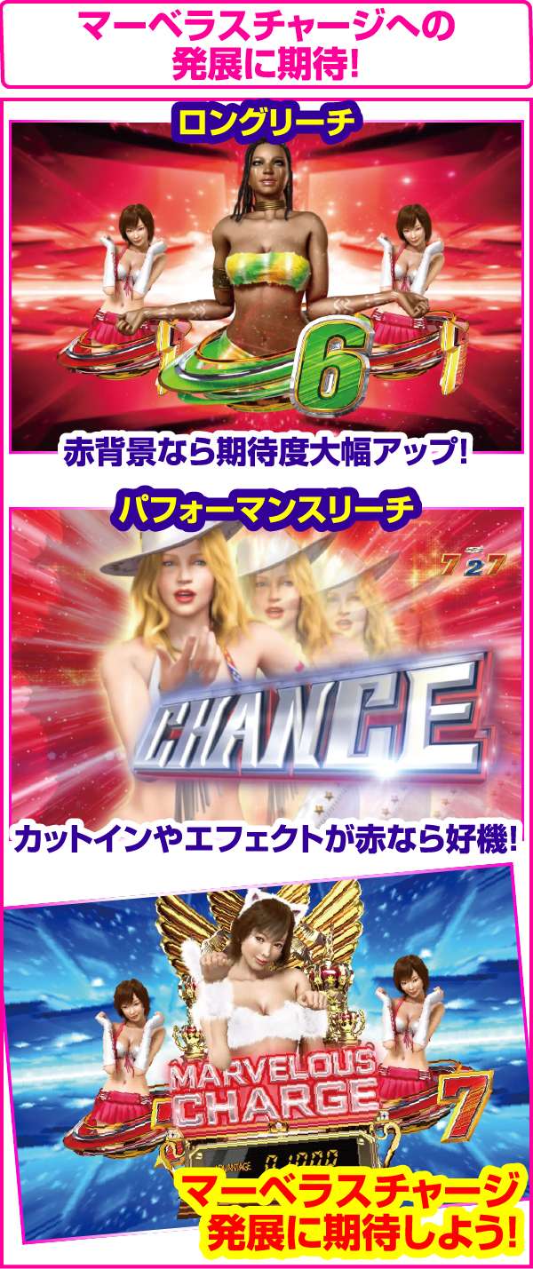 図柄変化は発展リーチに対応しており、全点灯ならばマーベラスチャージへ発展!!