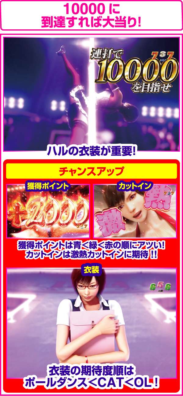 プレート色が赤や紫唐草模様、ハルが攻撃を仕掛ければチャンス。基本的にバトルの展開が有利なほど期待が高まる。また、ハルの名前が出ている時にSDキャラ群が通過すれば大当り濃厚!?