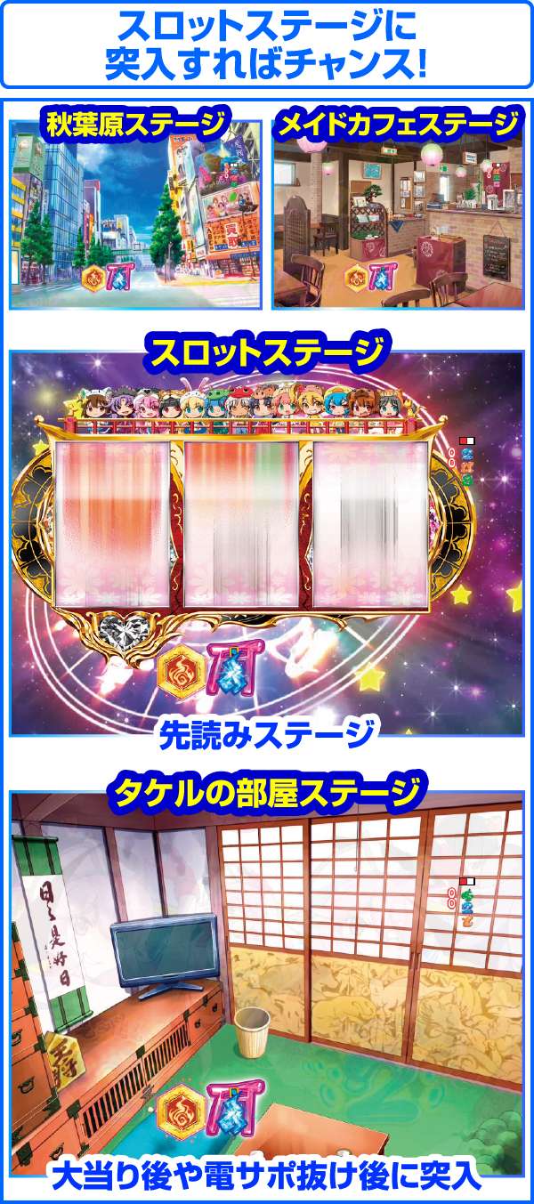 通常時のステージは4つ。スロットステージは移行すればチャンスとなる先読みステージ。移行時はその後の展開に注目しよう。