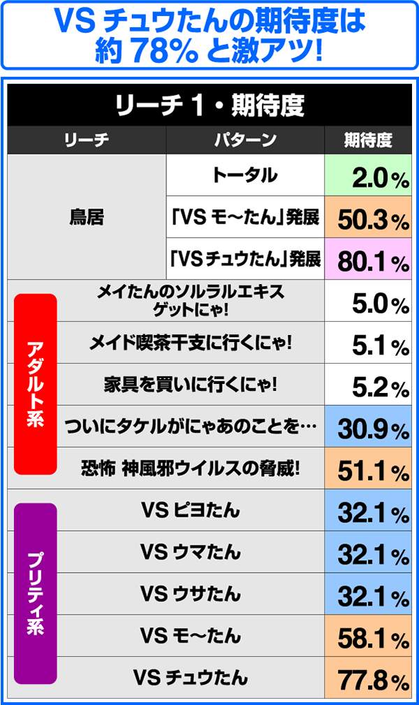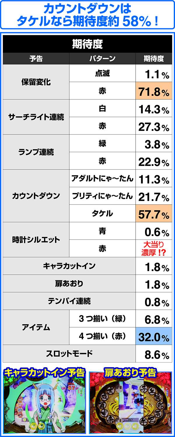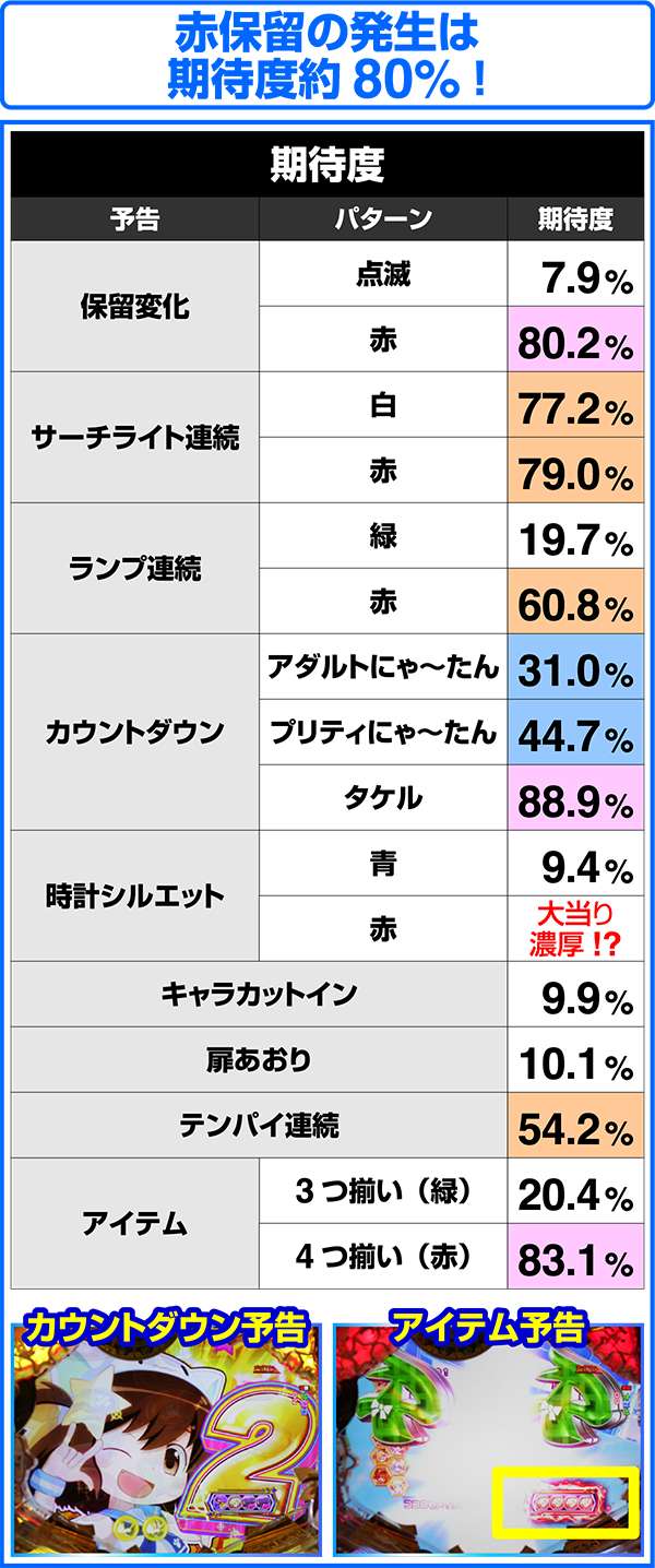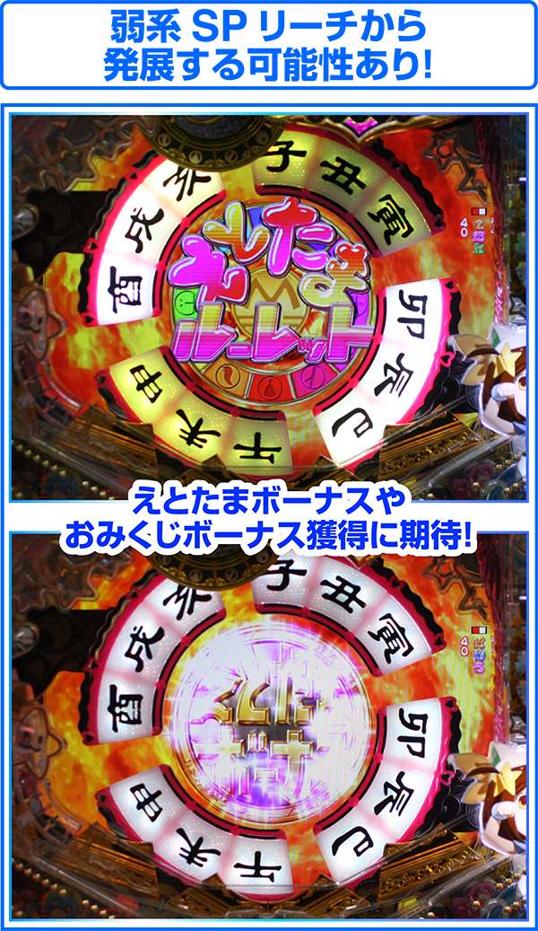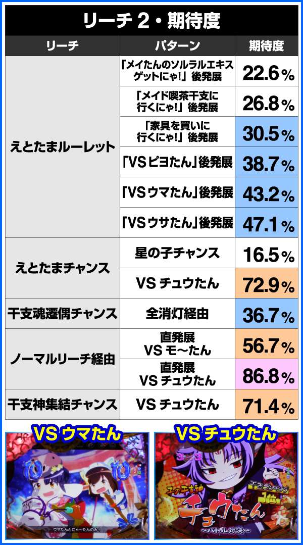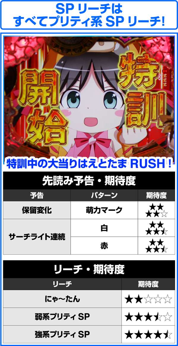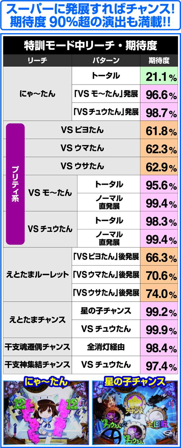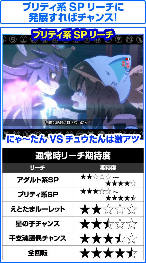 リーチは強系プリティSPが発展経路を問わず、激アツ。にゃ〜たんハズレ時は強系プリティSP発展、弱系プリティSPハズレ時はえとたまルーレット発展に期待したい。