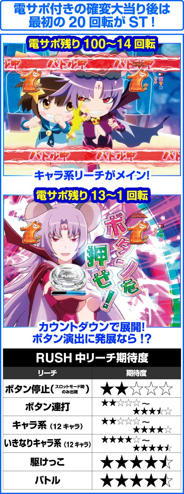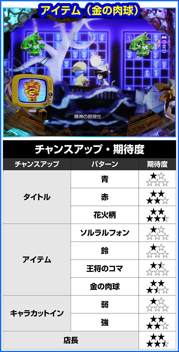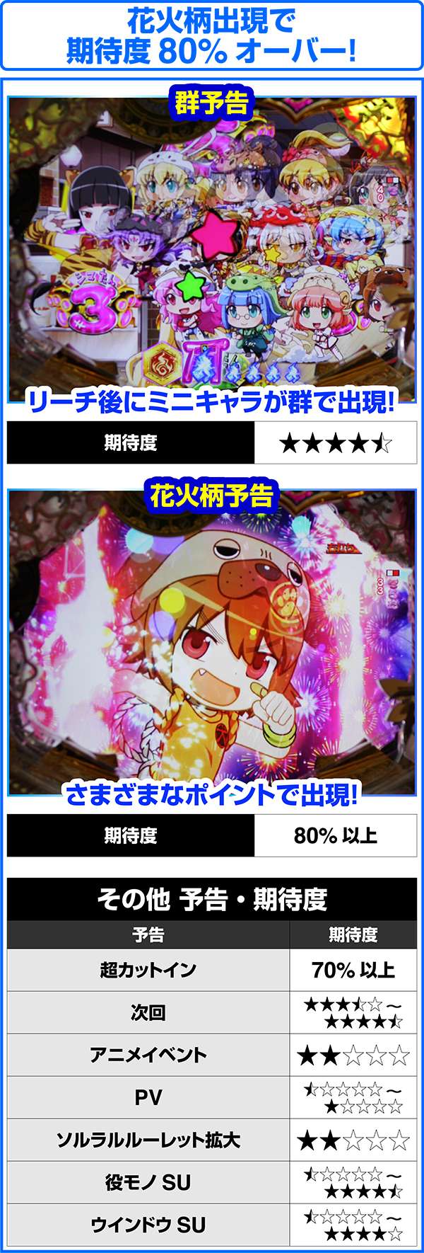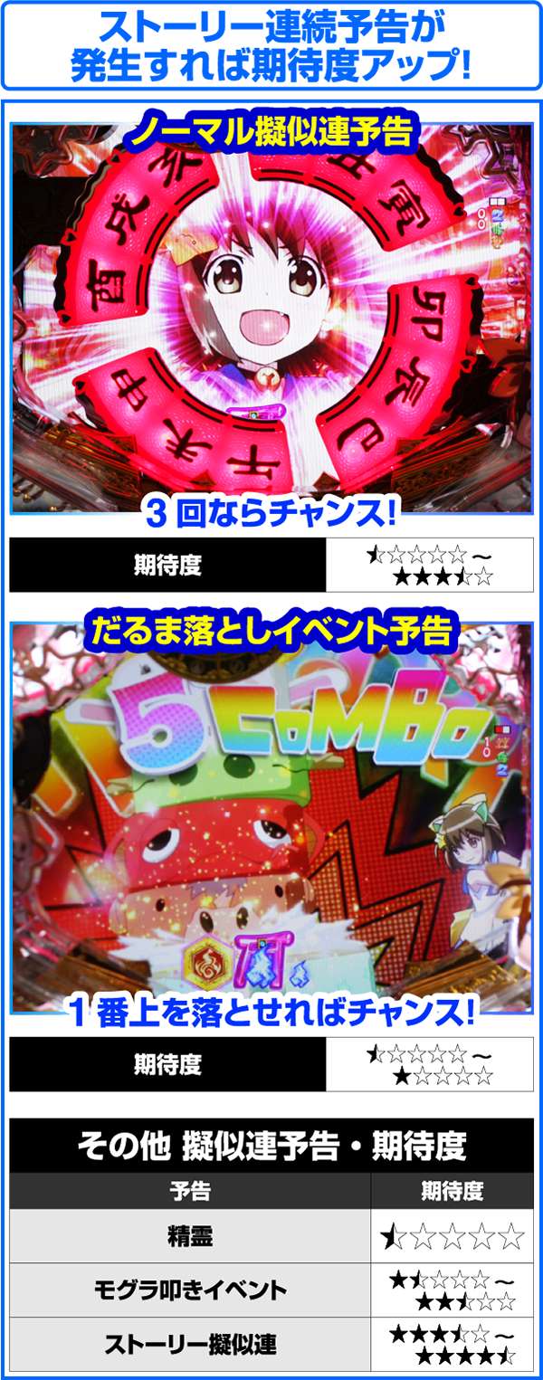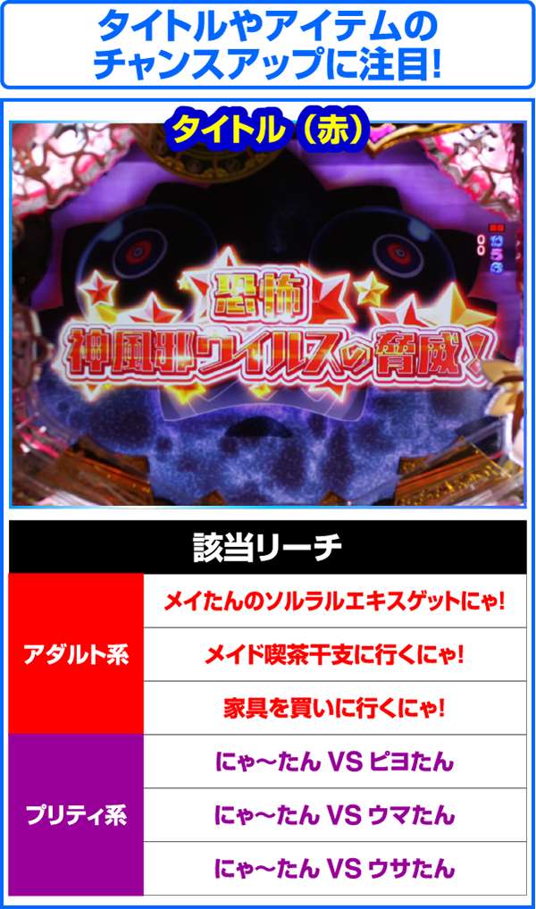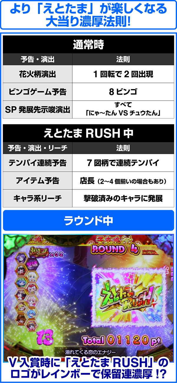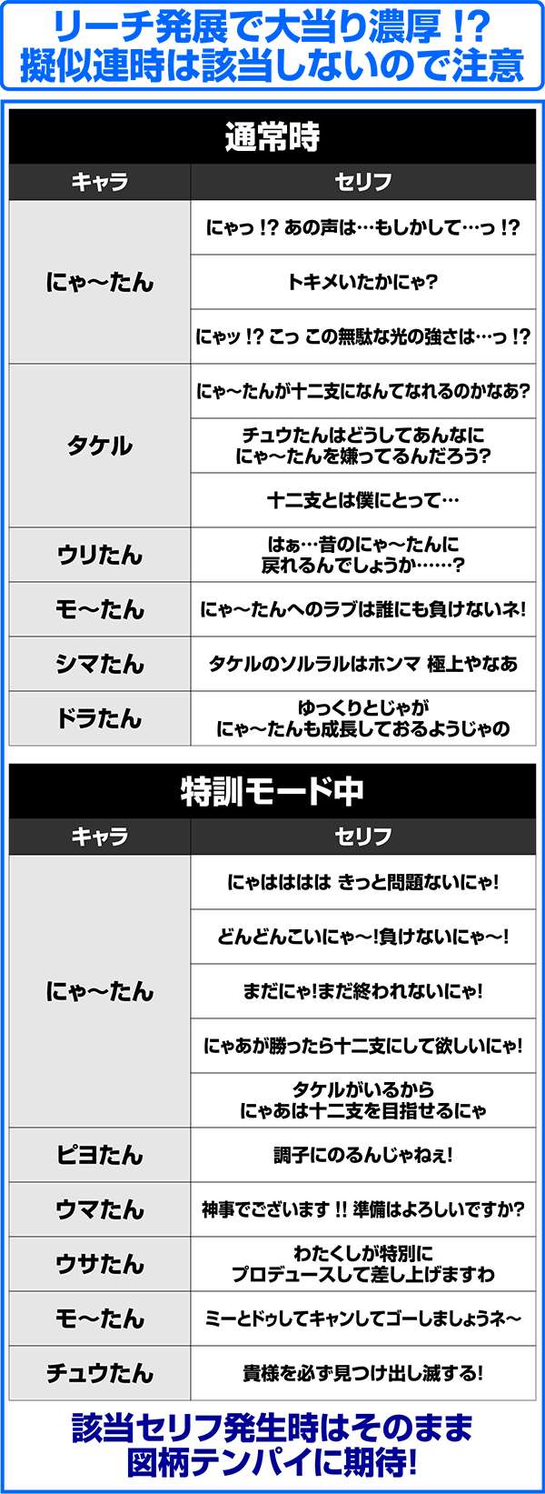 リーチは強系プリティSPが発展経路を問わず、激アツ。にゃ〜たんハズレ時は強系プリティSP発展、弱系プリティSPハズレ時はえとたまルーレット発展に期待したい。