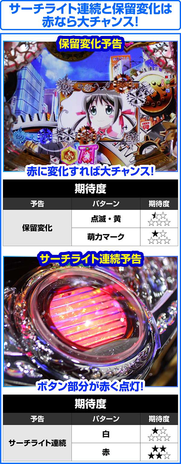 特訓モード中は赤系の予告の出現に期待。保留変化は通常時では期待薄の萌力マークも、特訓モードでは激アツだ!