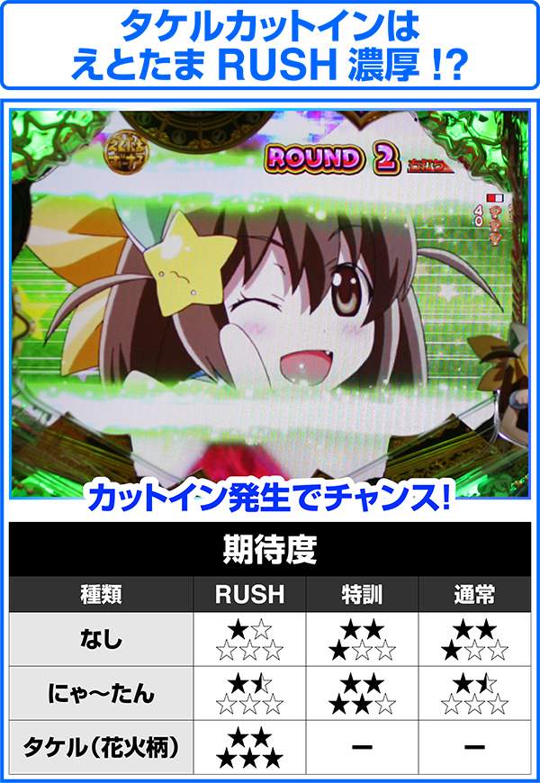 じゃんけんと尻相撲はカットインが発生する可能性がある。発生すればチャンスとなり、タケルカットインならばえとたまRUSHに突入濃厚!?