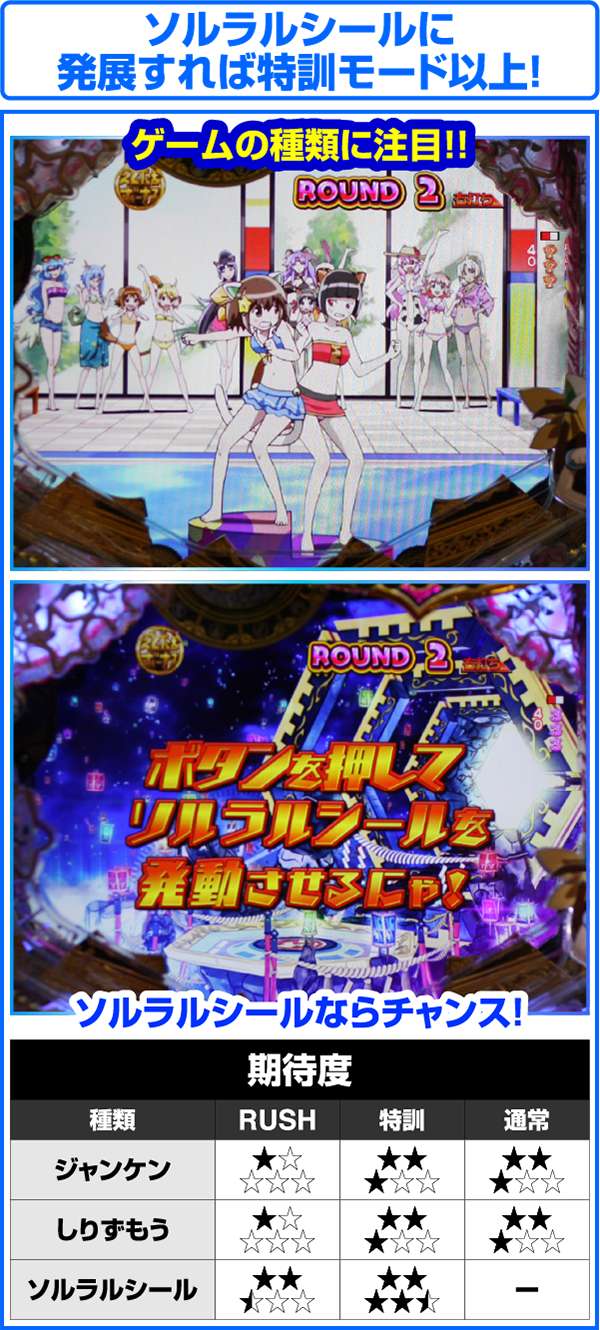 ソルラルシールはじゃんけんや尻相撲に発展と思わせてから移行する。発展時は特訓モード以上濃厚と、大チャンスだ!