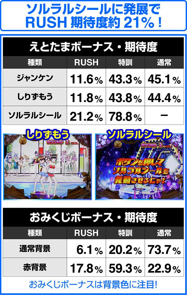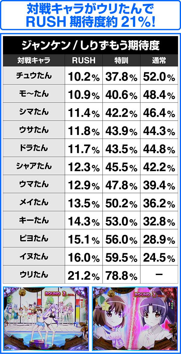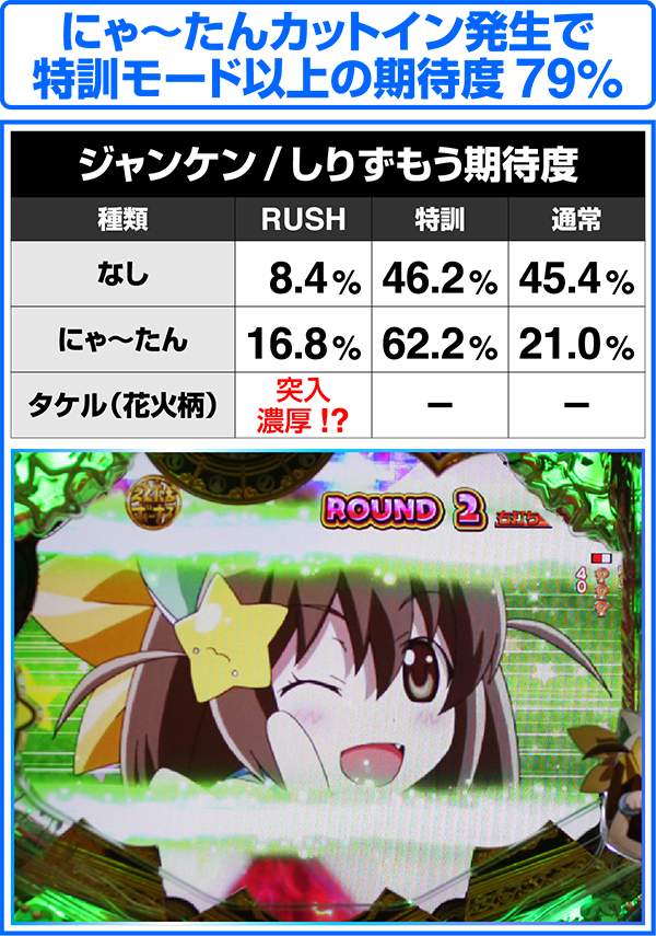 えとたまボーナス時における期待度はジャンケンじゃんけんはにゃーたんの出す手にも注目。チョキとパーはRUSH期待度12.9%、特訓期待度47.8%。グーは少し期待度が低く、RUSH期待度11.6%、特訓期待度43.1%となる。