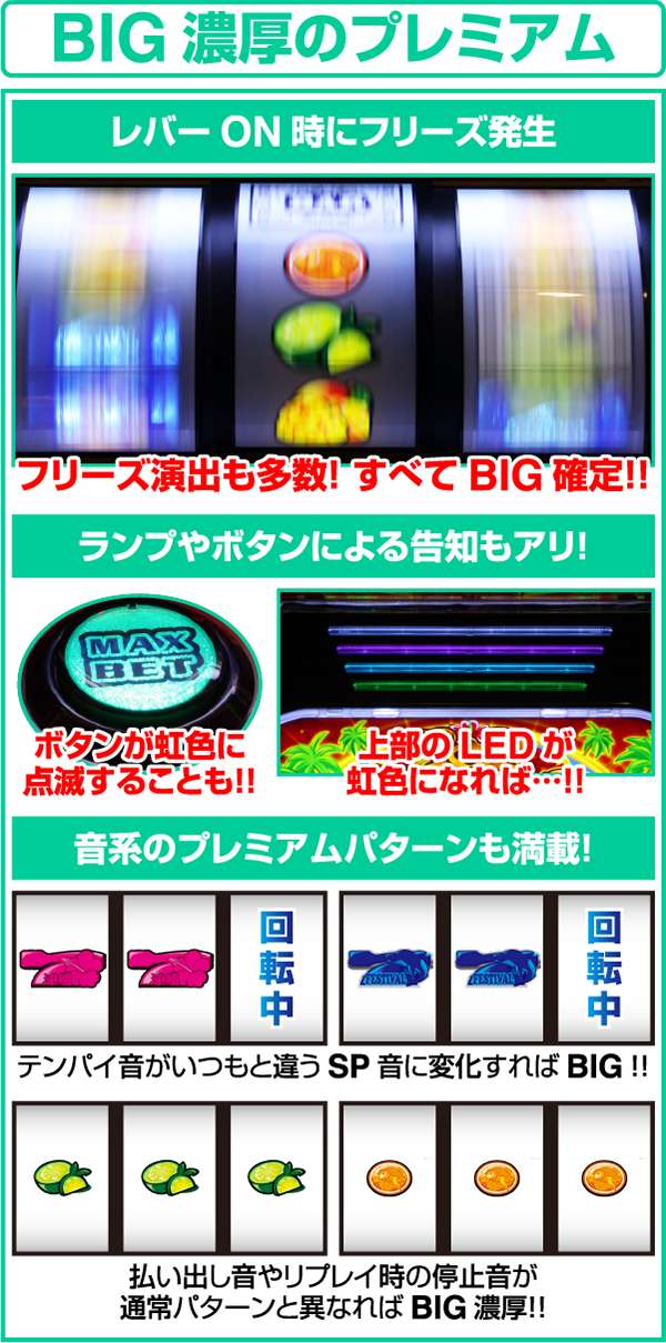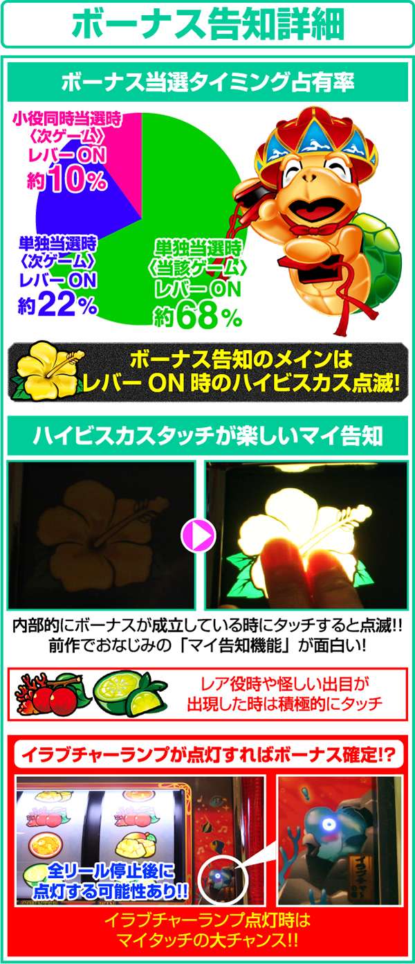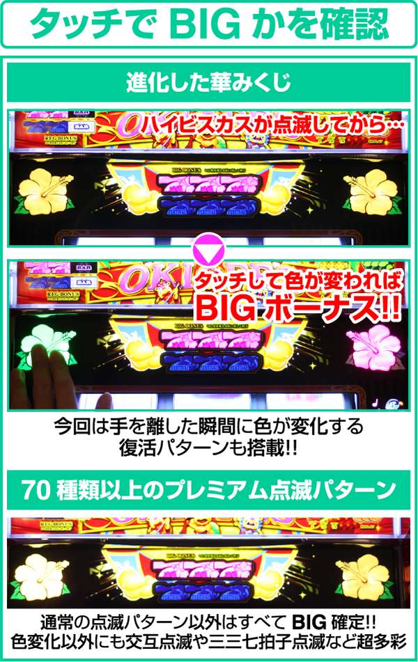 ハイビスカスの色変化だけでなく、発生した時点でBIG濃厚となるプレミアムパターンが多数。ほかにも遅れ変動などが存在している。
