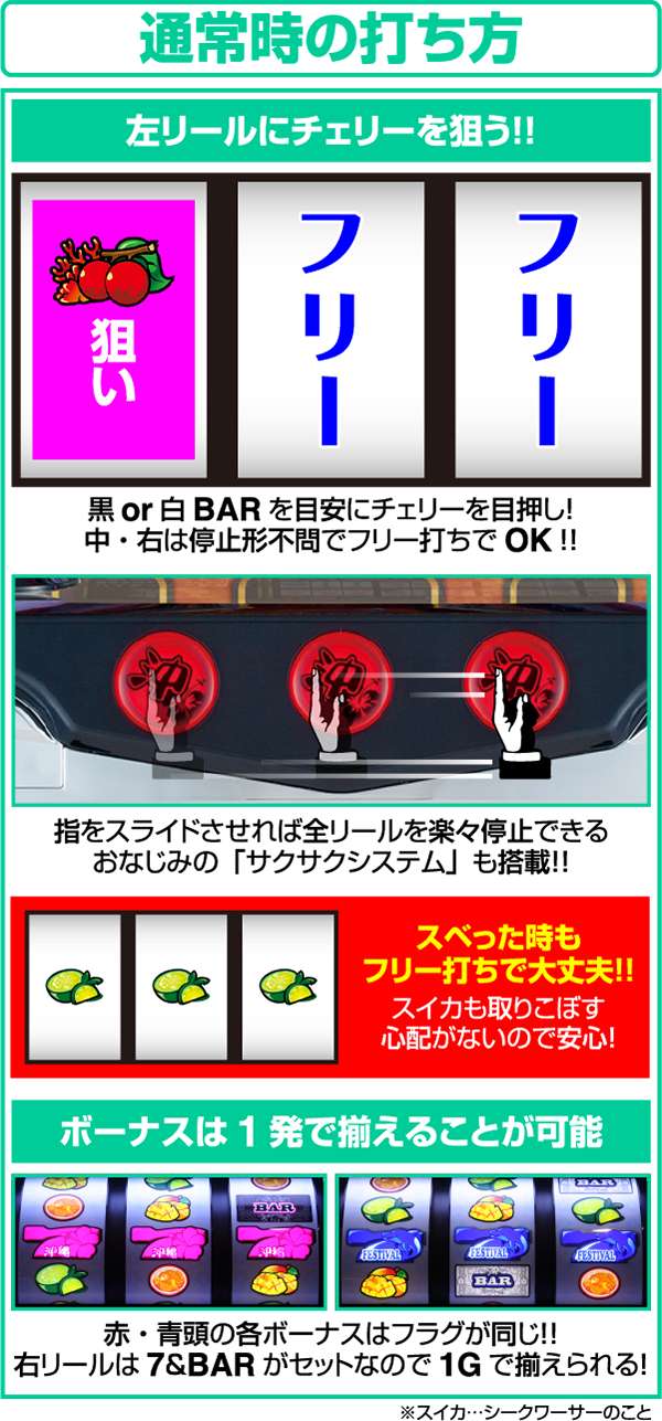 取りこぼしの可能性がある役はチェリーのみとなっているため、通常時に狙うのは左リールだけでOK。サクサクシステムも搭載しているので、左にチェリーを狙いつつ、指をスライドさせて快適に消化することが可能だ。