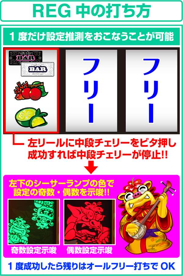 REG中は左リールに中段チェリーをビタ押しで止めると、全リール停止後に筺体左下のシーサーランプが点灯。シーサーの色には緑・赤の2種類があり、緑が奇数設定、赤が偶数設定を示唆している。