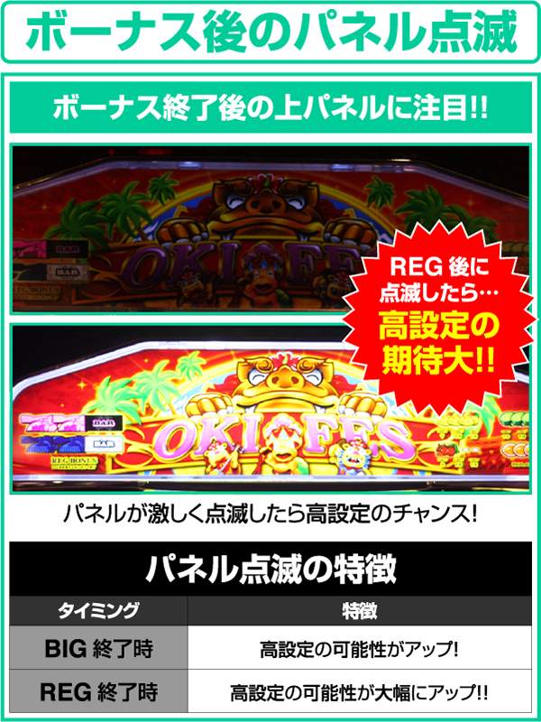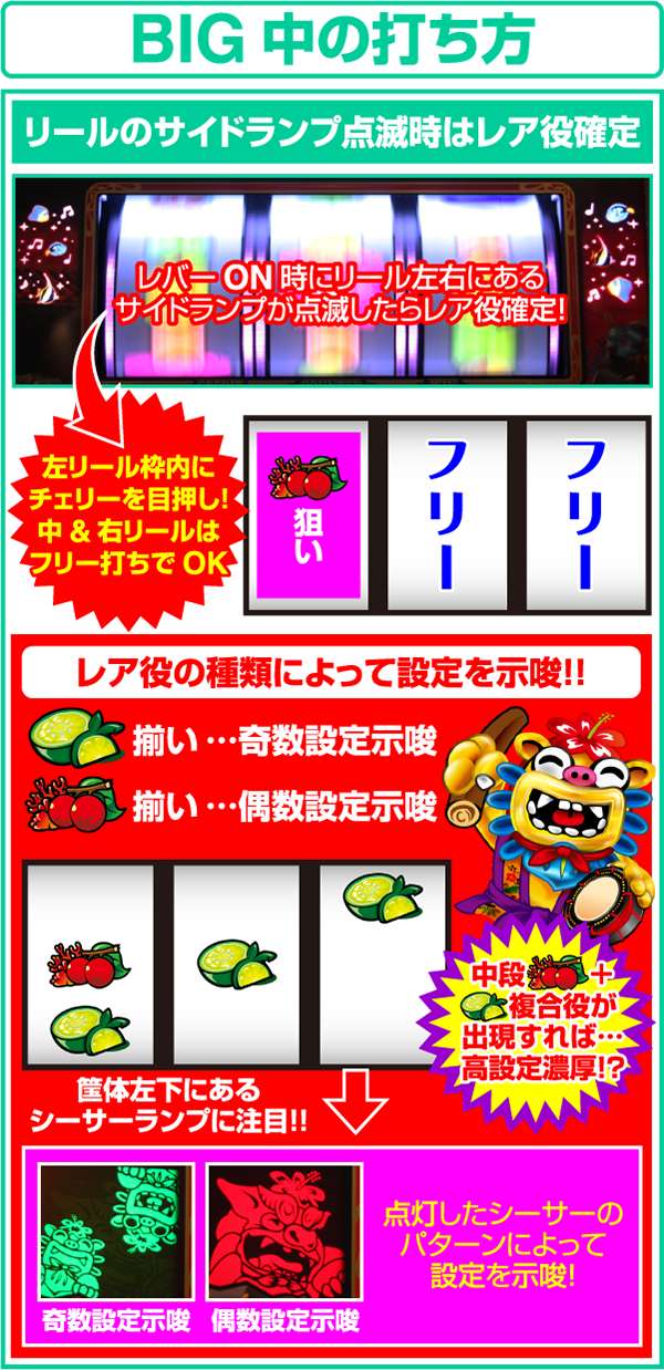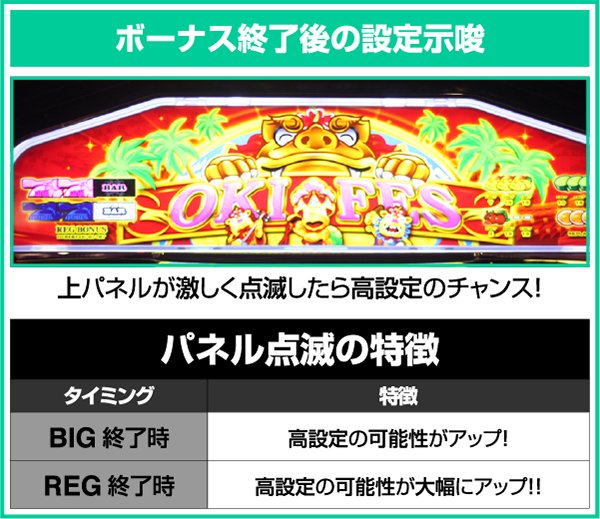 また、サイドランプ点滅時に中段チェリーが出現した場合は高設定の可能性大。全リール停止後は筺体左下にあるシーサーランプで設定の奇数・偶数が示唆される。