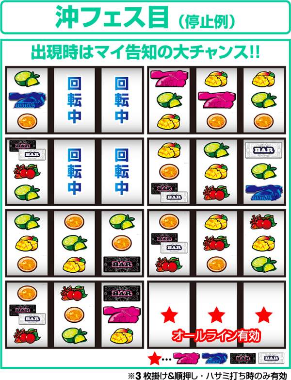 完全告知のボーナスタイプとして人気を博していた「沖縄フェスティバル」が1年の時を経て、“もっと”楽しくなって登場する。 イラブチャーランプやシーサーランプなど新要素も多数搭載。 黄金に輝くハイビスカスをはじめ、聞いているだけで楽しくなるようなBGMの数々…まさに沖スロの魅力が凝縮された1台となっている。 |