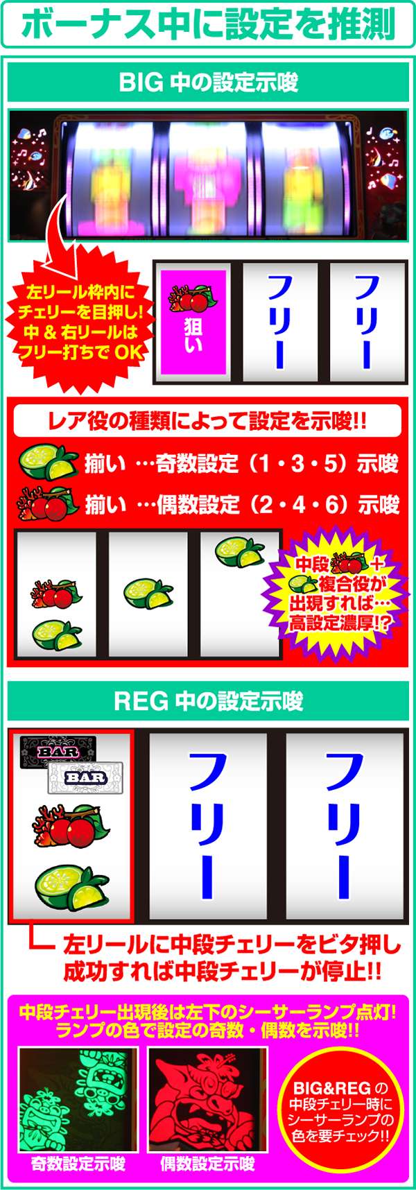 揃った役で設定が示唆されており、奇数設定ならスイカが、偶数設定ならチェリーが揃いやすくなっている。