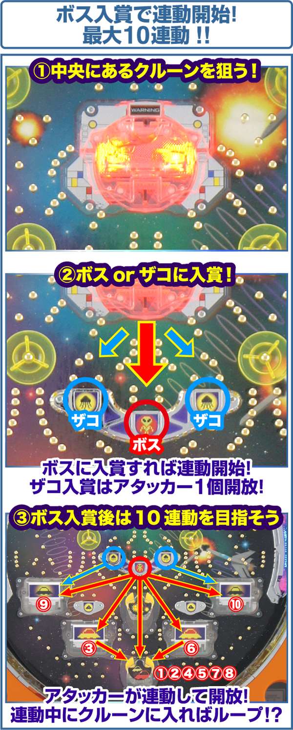 愛喜が放つ普通機第2弾がテイクオフ! パチンコ玉という武器を駆使し、謎の生命体とのバトルを楽しもう。ボスチャッカーに入賞すれば大当りとなり、チューリップの連動が開始。 最大10連動をゲットせよ!! |