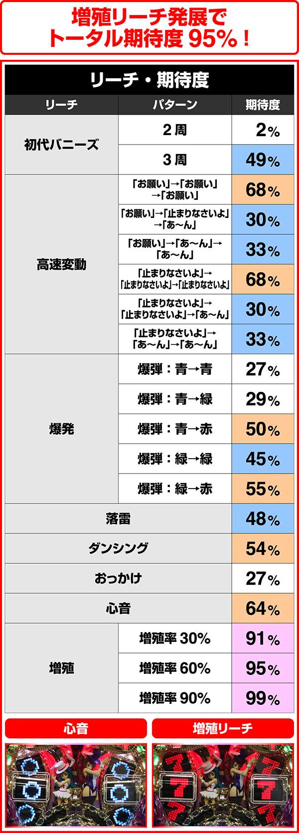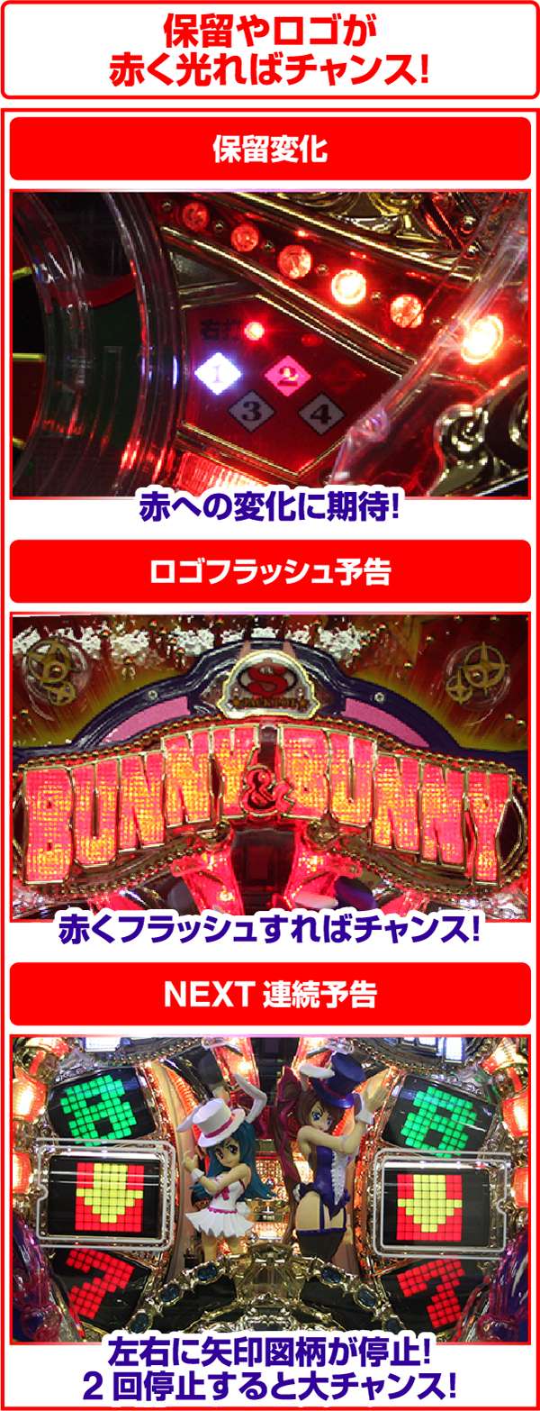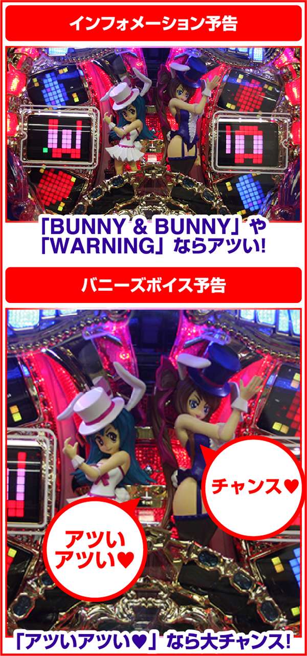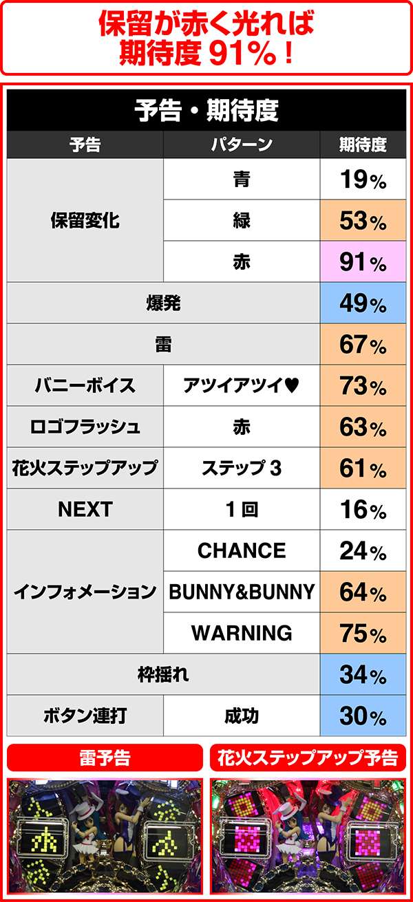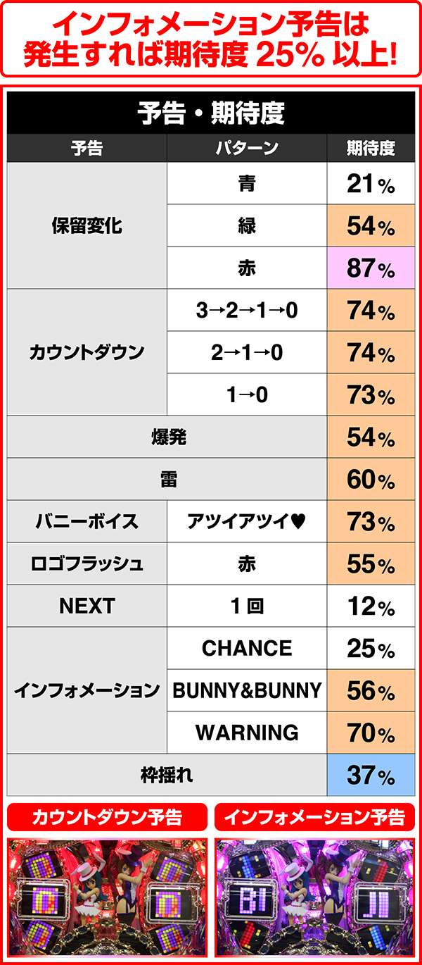 高期待度となる予告は雷予告、ロゴフラッシュ予告・赤、インフォメーション予告(BUNNY&BUNNY や WARNING)だ。