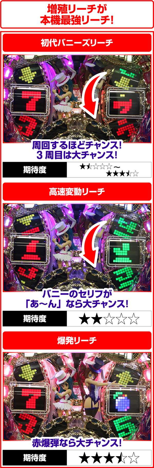 初代バニーズリーチは3周目発展、爆発は赤以上など、高期待度チャンスアップの発生に期待しよう。