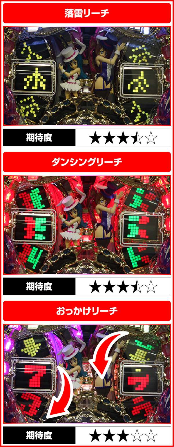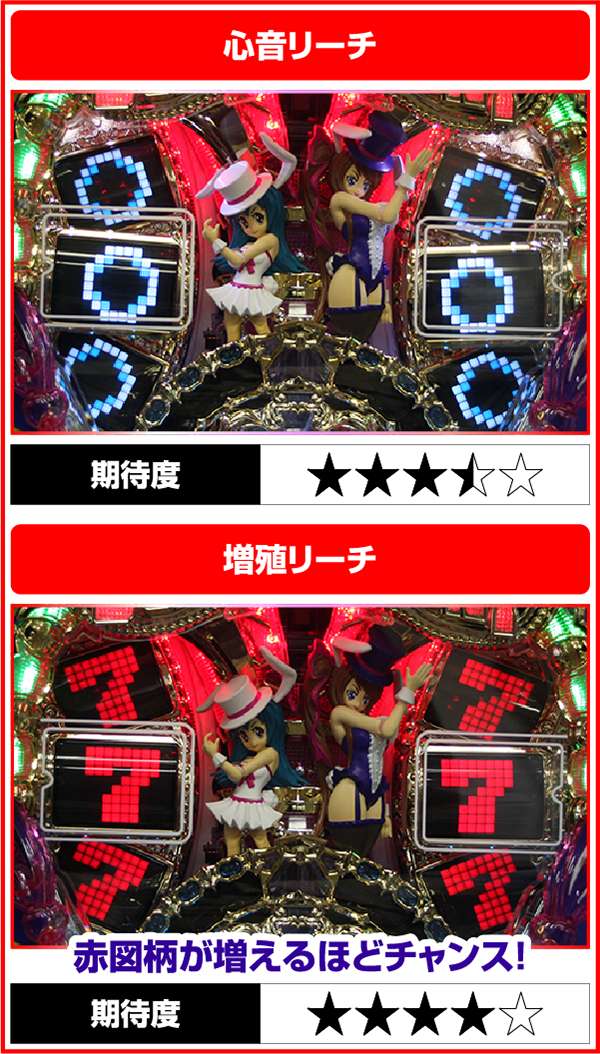「おっかけリーチ」、「心音リーチ」、「増殖リーチ」は、通常のリーチ(左中段に3or7図柄停止)を経由せずに発展するスーパーで、大当りの大チャンスとなるリーチ系統だ。