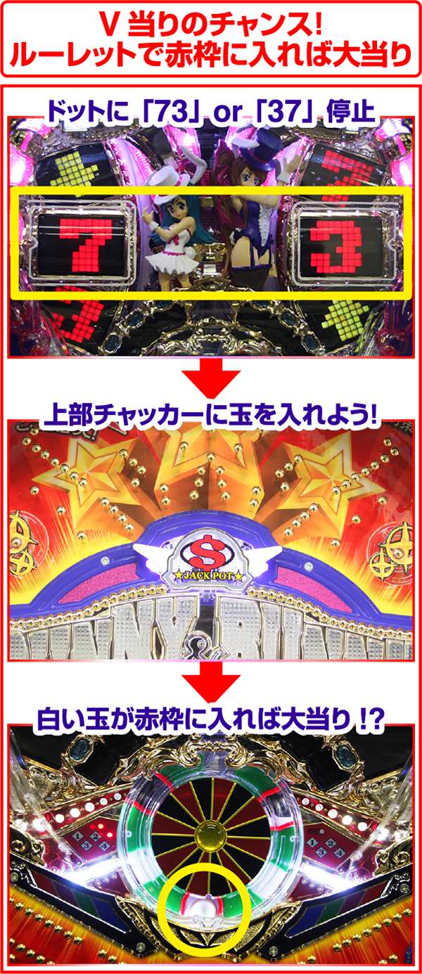 中央ドットに「73」or「37」が停止すればバニーズチャンス。上部チャッカーに玉を入賞させ、ルーレットの赤枠に白い玉が入ればV当り。