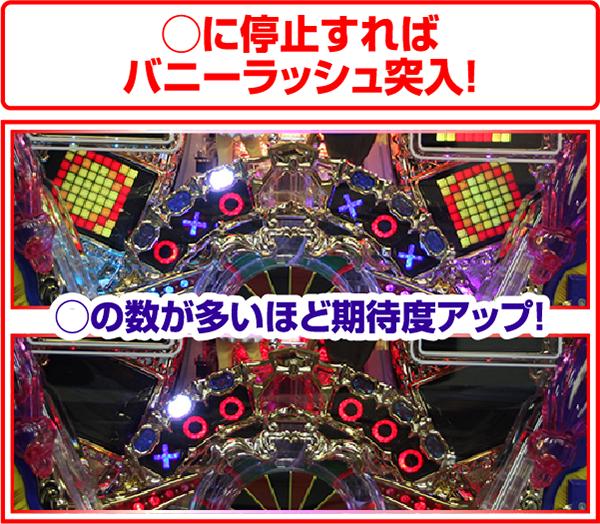 初当り時のラウンド終了後に発生するバニーラッシュ突入をかけた演出。基本的に◯の数が多いほど期待度が高く、◯に停止すればバニーラッシュに突入!!