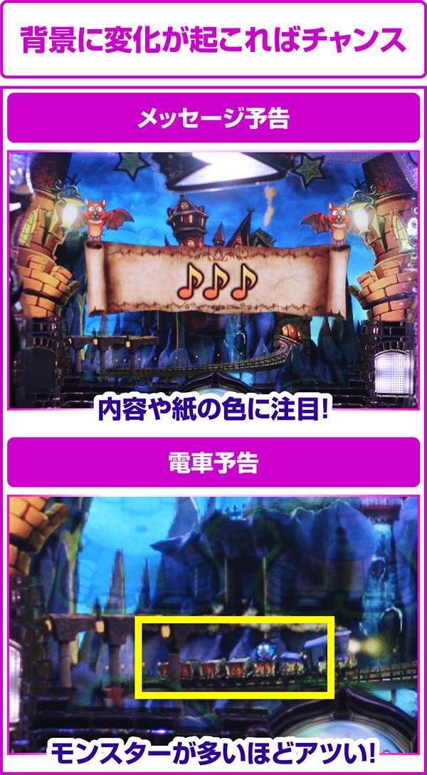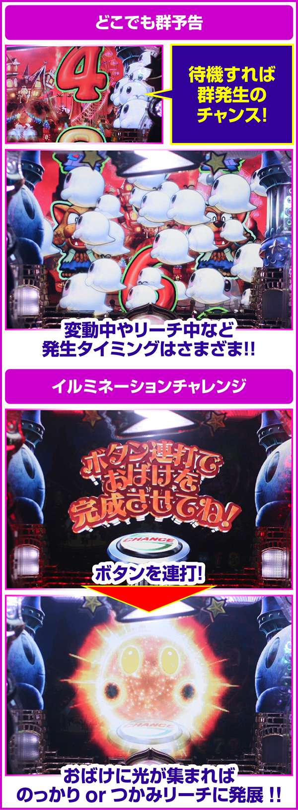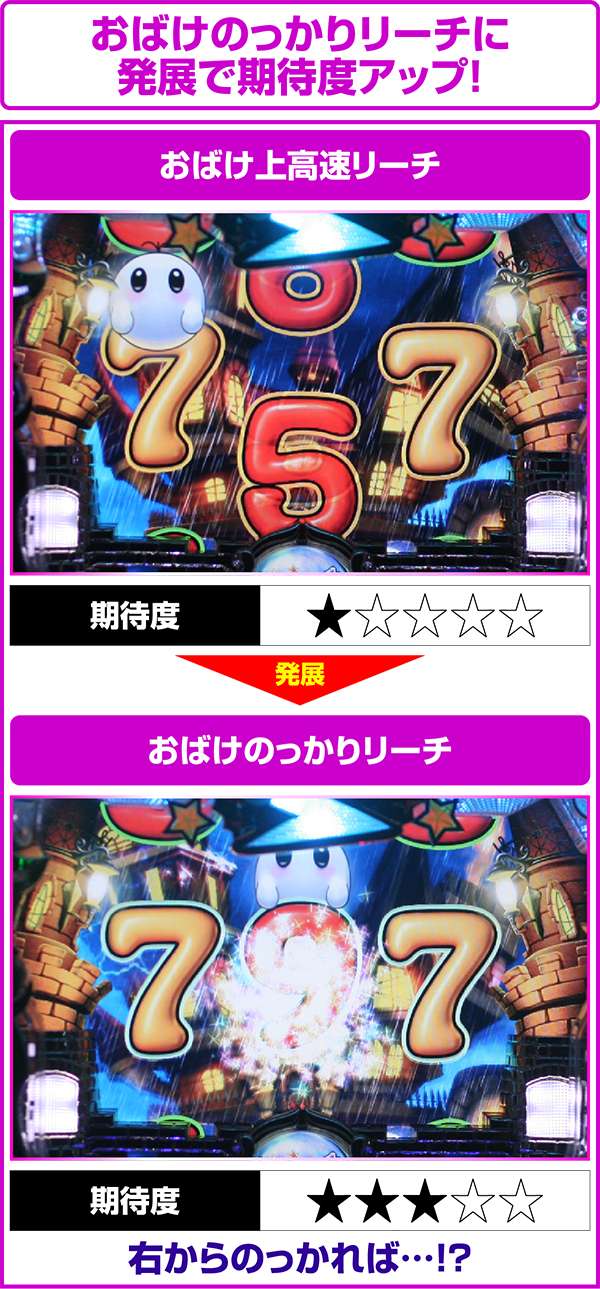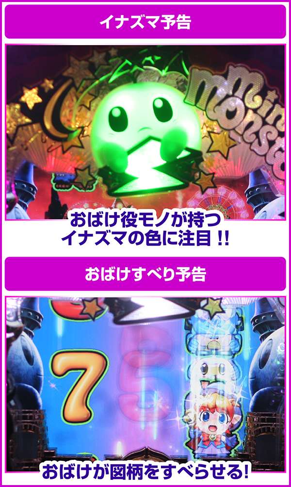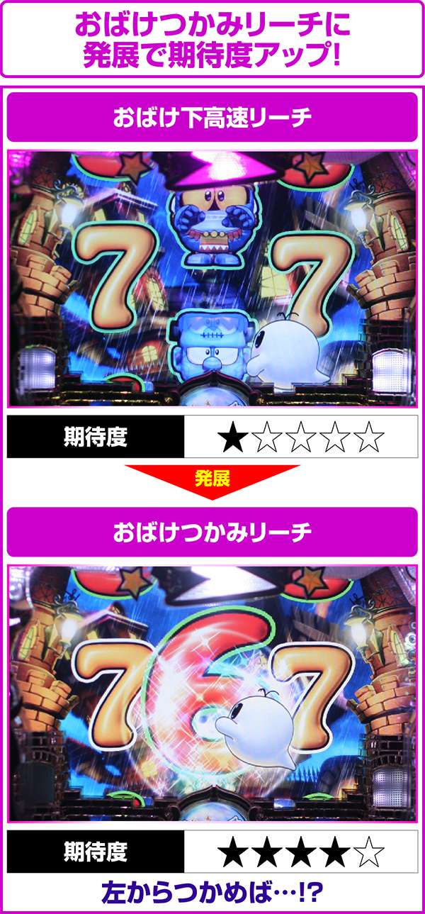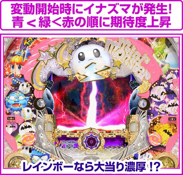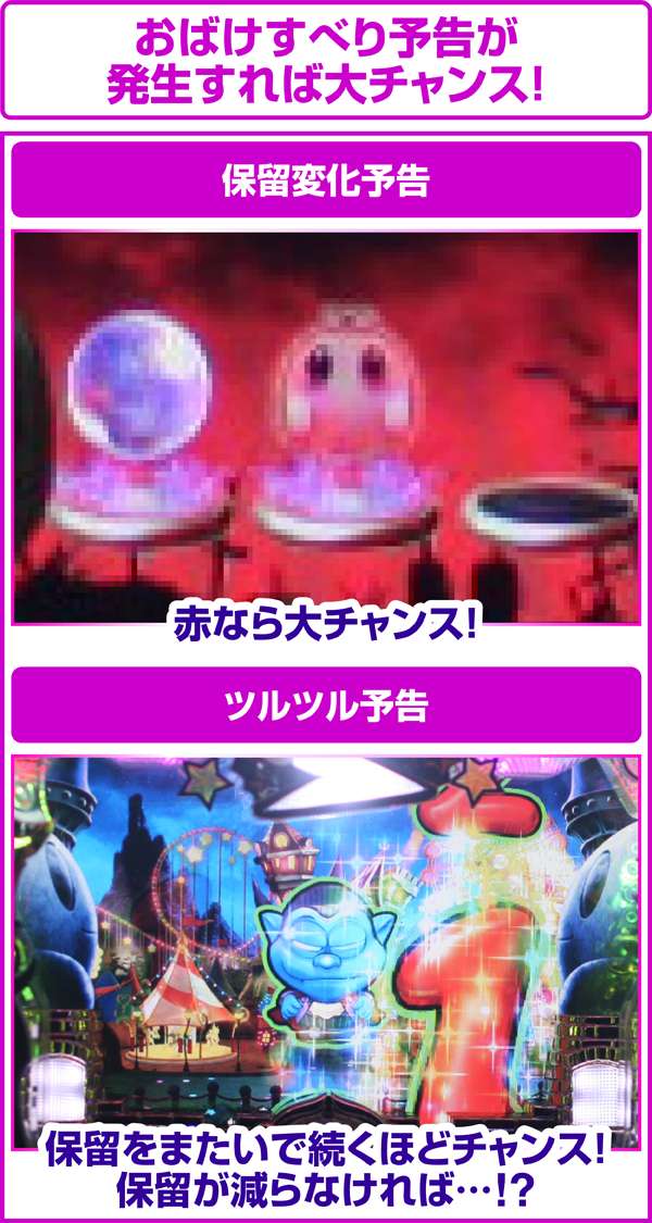 変動開始時などに、おばけ役モノが持つイナズマが光るイナズマ予告は、赤く光ればチャンスだ。