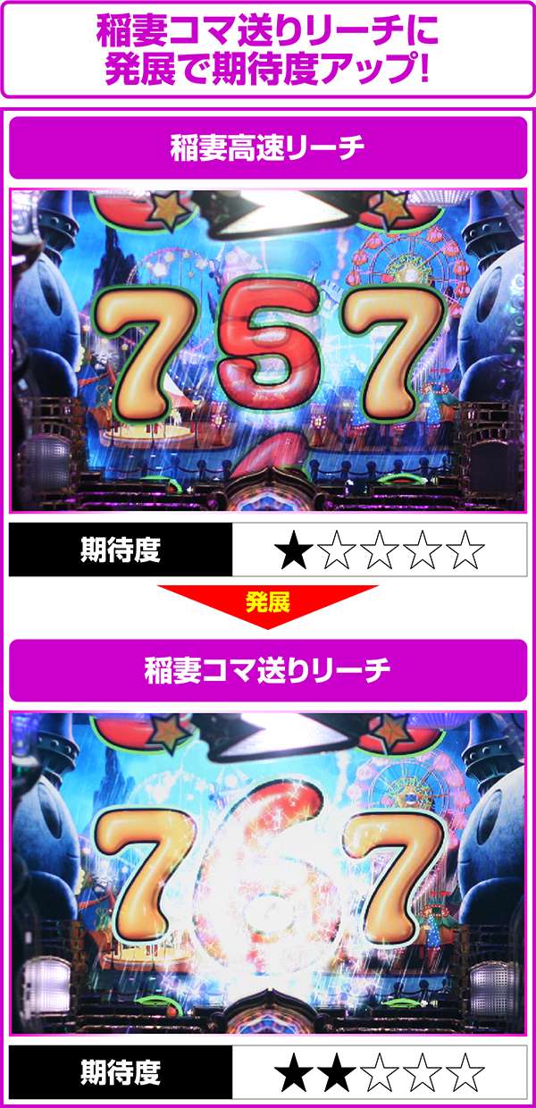 また、イナズマランプは「キャラクターアクション予告」でも活躍。キャラクターが動くアクションと連動してランプが点灯する。色のパターンはフラッシュ先読み演出と同様。