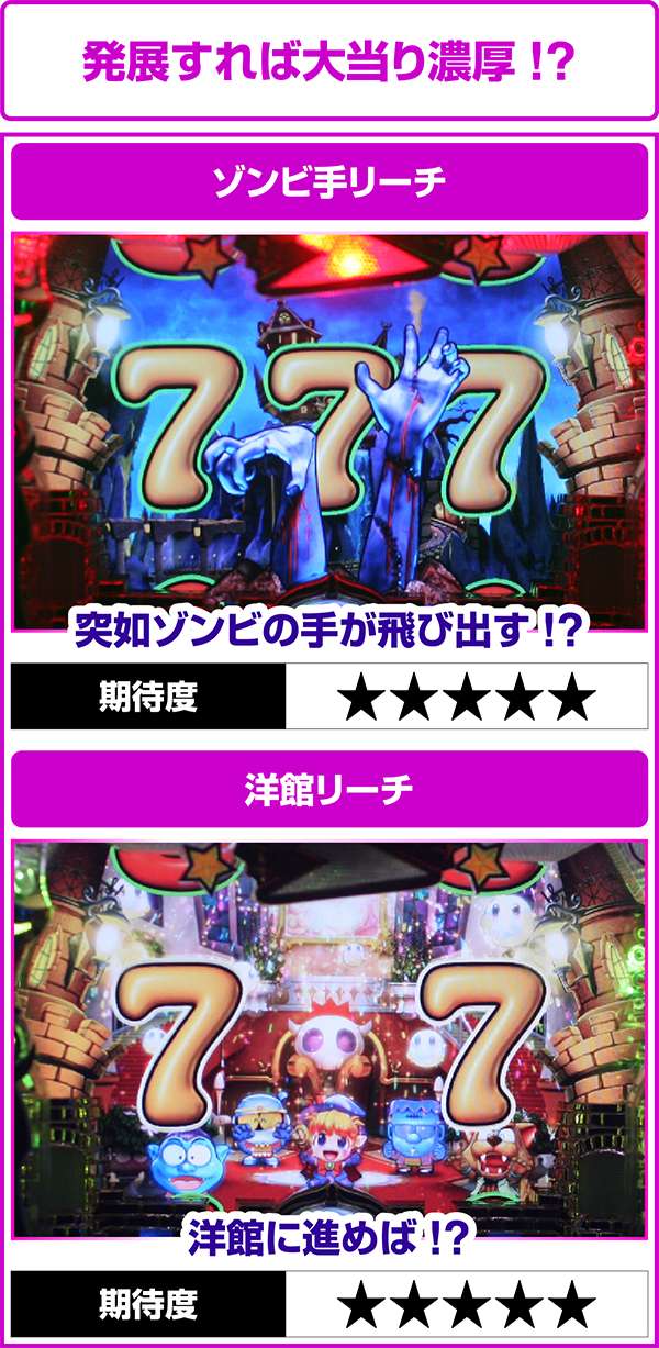 リーチ成立時におばけ群が出現すれば、大チャンスだ。こうもり群やレインボーのおばけ群が発生すれば、大当たり濃厚!?