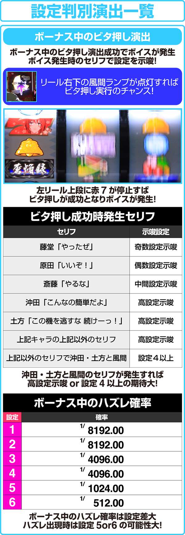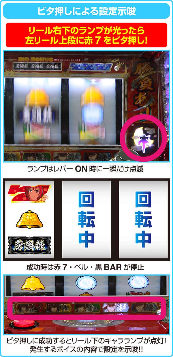 ビタ押し成功時はリール下のランプが点灯し、どのキャラが喋ったかが判別できる。セリフと合わせて設定推測の要素として活用しよう。