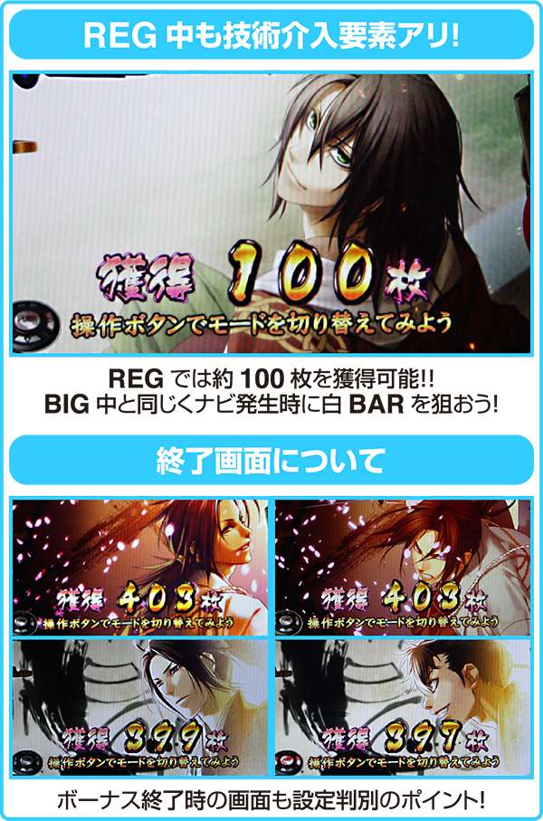 恋愛ADV、そして様々なメディアで人気を博した「薄桜鬼」がパチスロで登場。 本機はボーナスのみで出玉を増やしていくタイプとなっており、獲得枚数はBIGが約400枚、REGが約100枚。BIGの獲得枚数が多いだけでなく、設定1でもボーナス合算確率は約1/199、BIG比率が54%と短時間勝負にも適した仕様となっている。「MAX-Atype」と命名された本機にて、パチスロ本来の楽しさを体感せよ! |