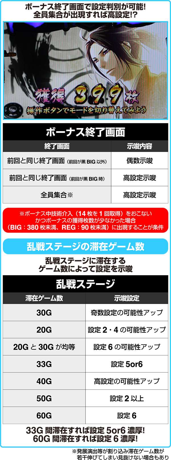 また、ボーナス終了画面に登場するキャラクターでも設定示唆をおこなっている。