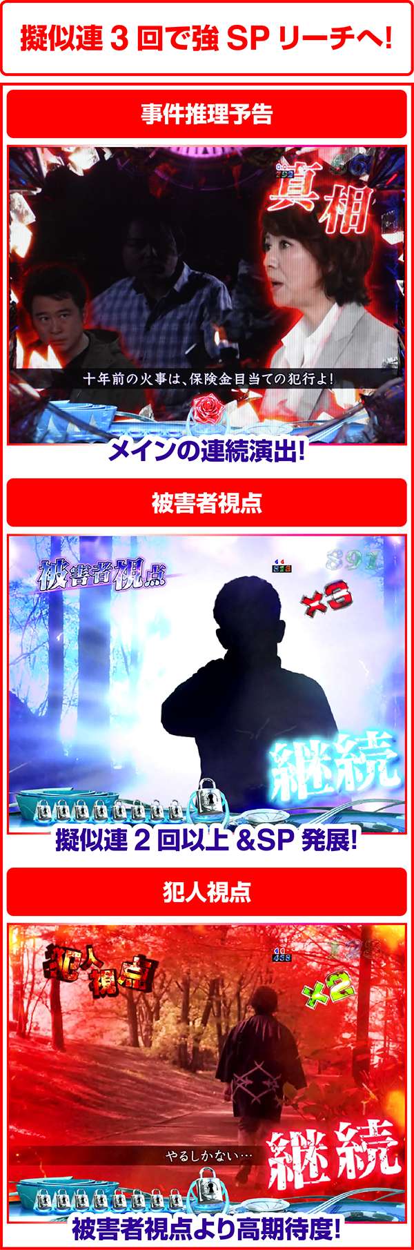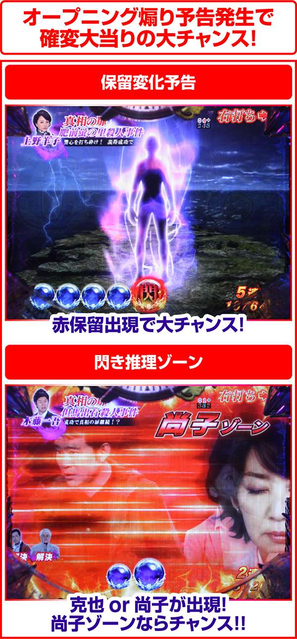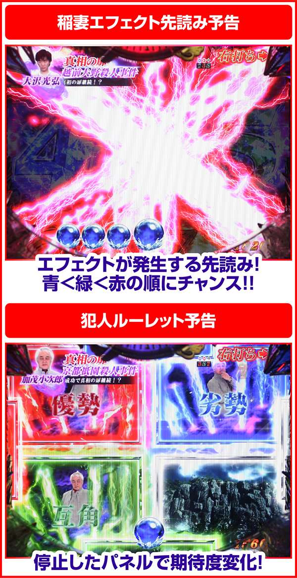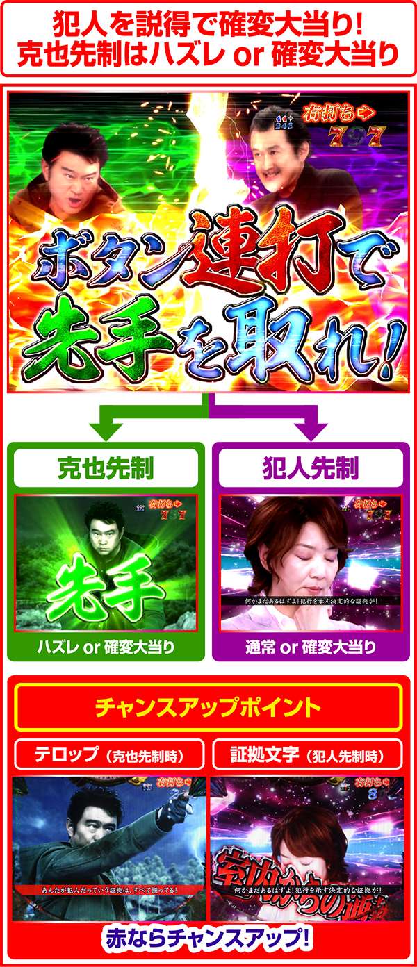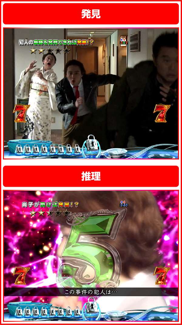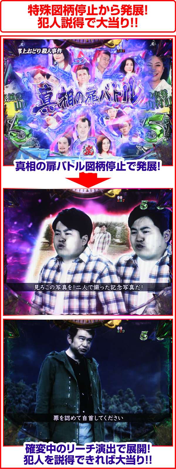 演出は確変中における真相の扉中のリーチが展開し、犯人を説得できれば大当りだ!
