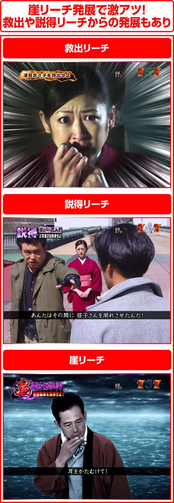 激アツの崖リーチは弱SPリーチからだけでなく、救出や説得リーチ中からも発展。
