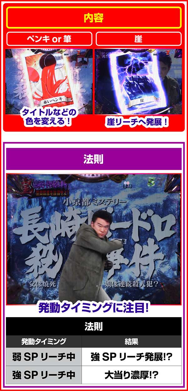 また、法則として弱SPリーチ中に獲得できれば、強SPリーチへの発展が濃厚。強SPリーチ中に切り札演出が発動すれば大当り!?
