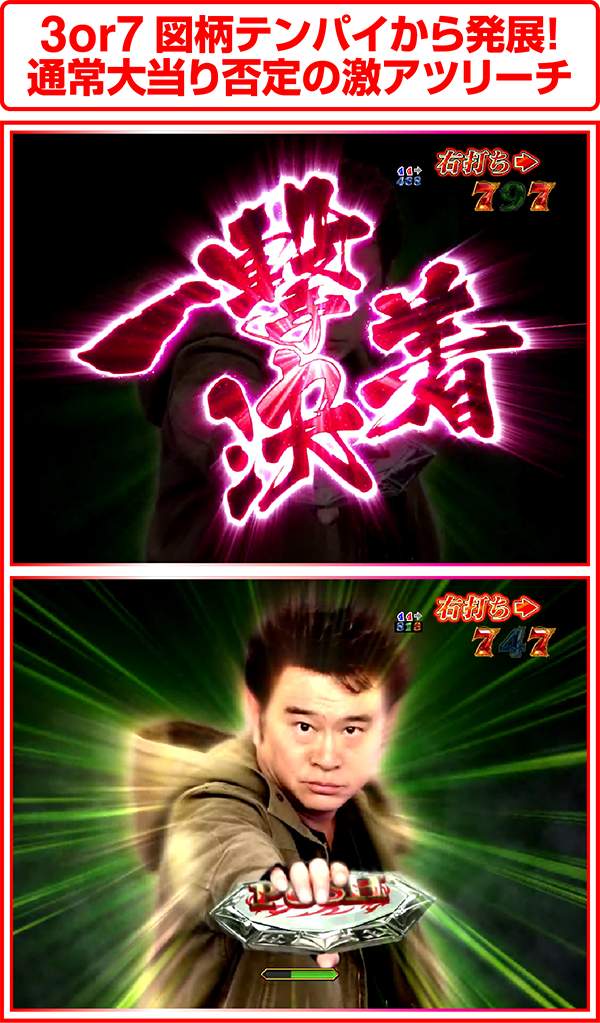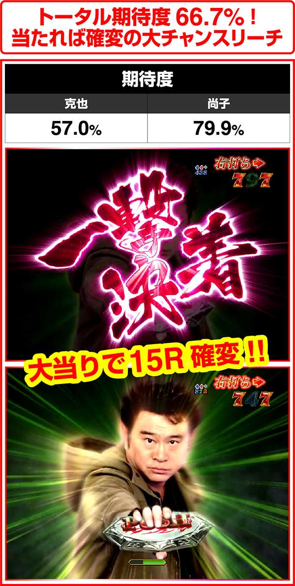リーチ中は克也が先制すればチャンス。通常大当りの心配はなく、ハズレor確変大当りの安心ルートだ。