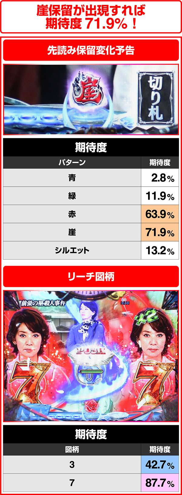 保留は赤と崖に変化すれば、半数以上が大当りに繋がる。