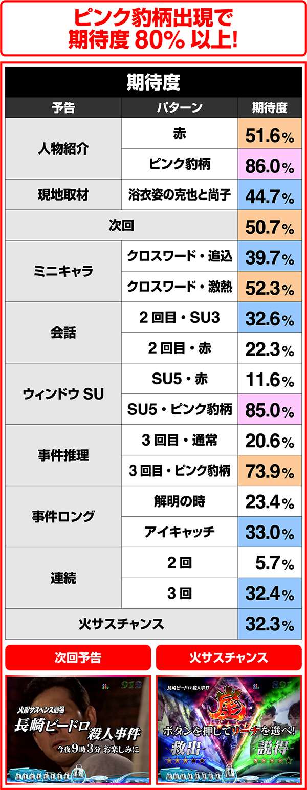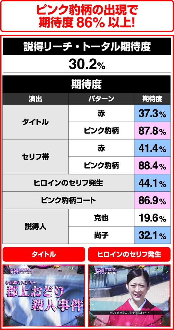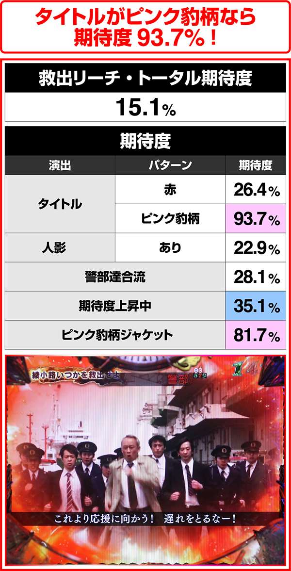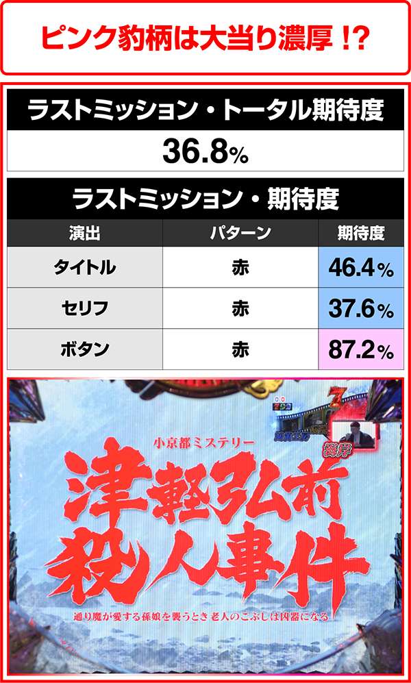 激アツとなるピンクの豹柄の出現ポイントは2箇所。タイトルで出現すれば期待度93.7%だ!