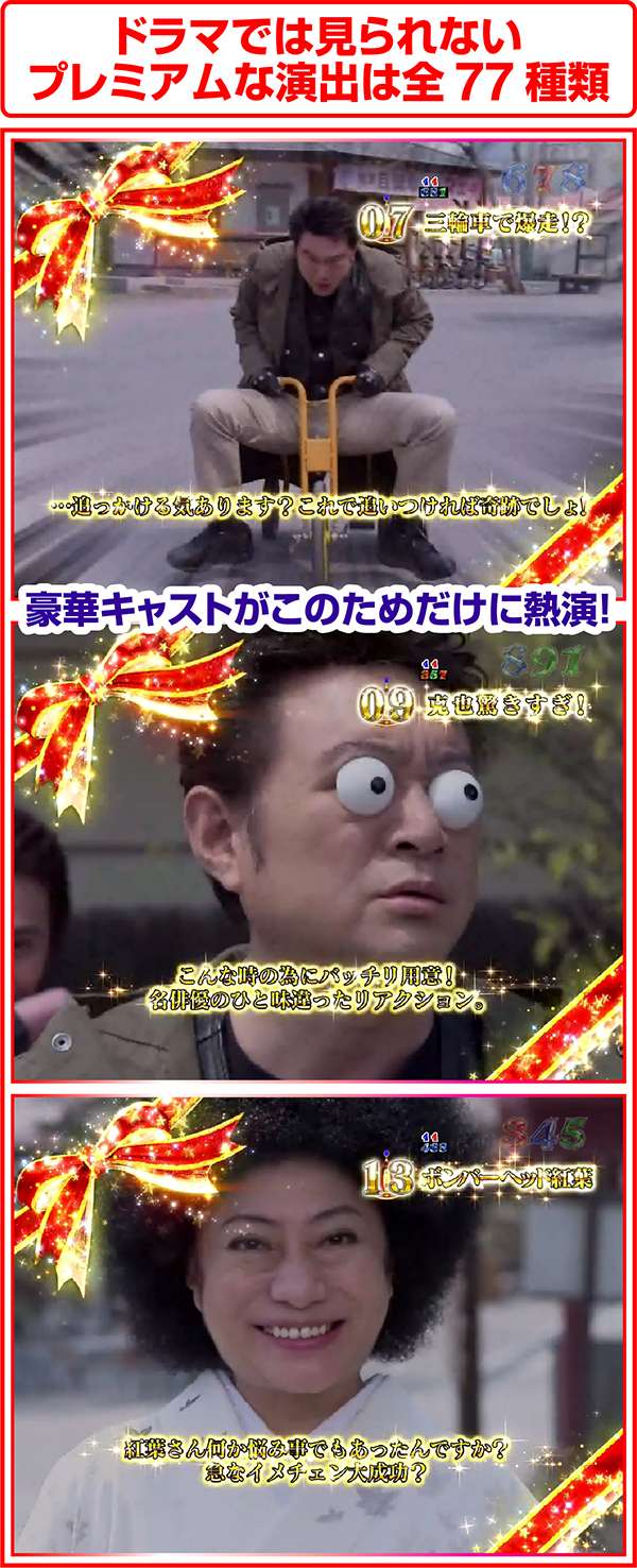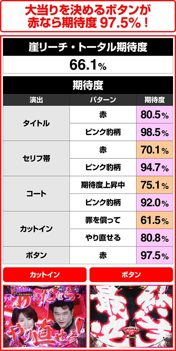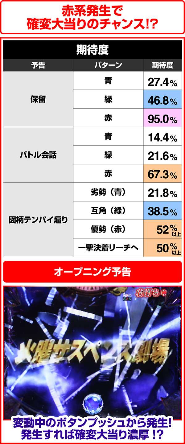 共通のチャンスアップはタイトル、テロップ、カットインの色。赤はチャンス、ピンクヒョウ柄なら激アツだ!