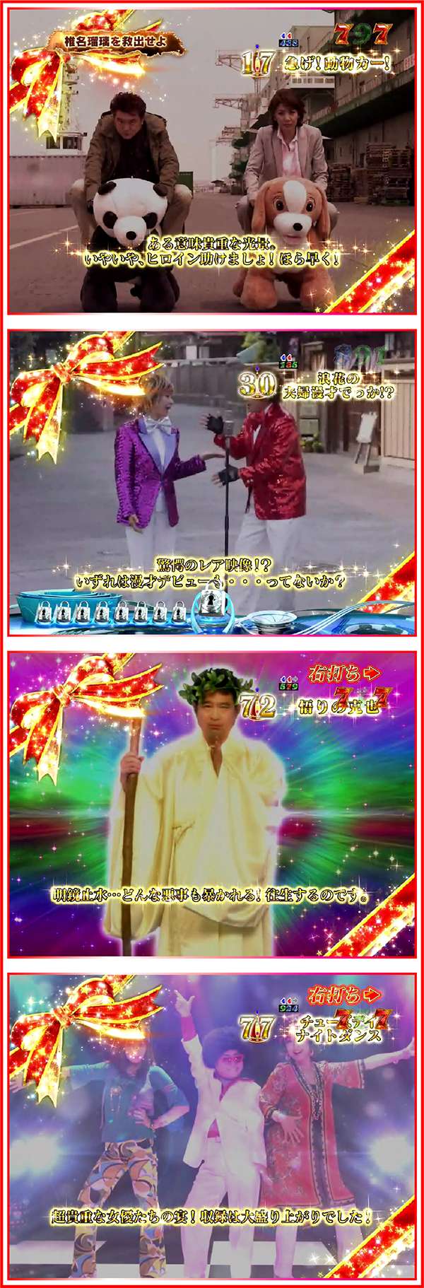 通常当たりでも時短100回付いてくる安心感。演者さんが中々豪華。今見ると懐かしさを覚える人もチラホラと。紅葉さんノリノリで可愛い。確変中は犯人との1対1の闘いが燃える。…えっ