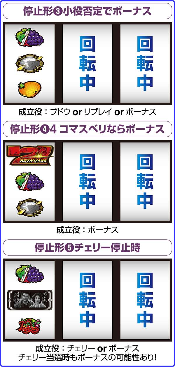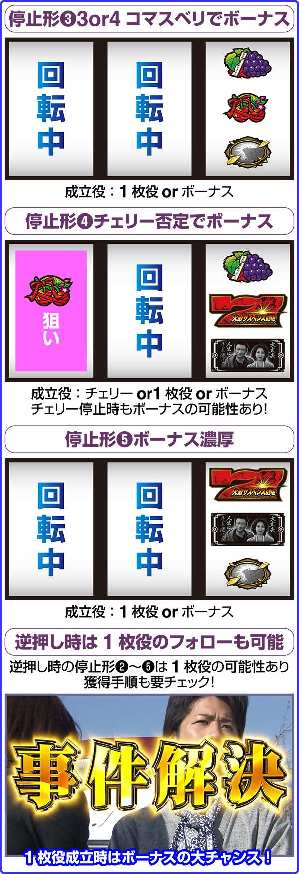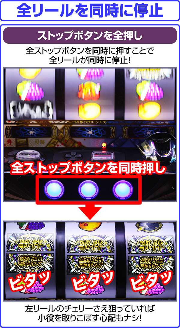 たとえば、BIG中の事件解決絵柄を揃えるチャレンジも、一度成功することができれば、その後は全押しで同時に止めることが可能となる(事件解決絵柄自体のビタ押しは必須)。