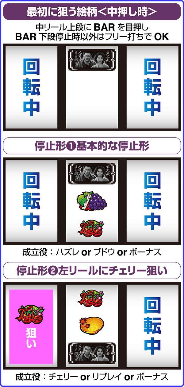 ストップボタンを同時に押すことで、リールを同時に停止することができる。1枚役を除き、左リールはチェリーさえ狙えば取りこぼしはないので、いつでも全押しで楽しむことが可能。
