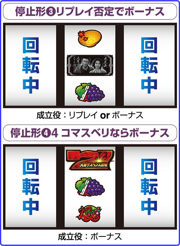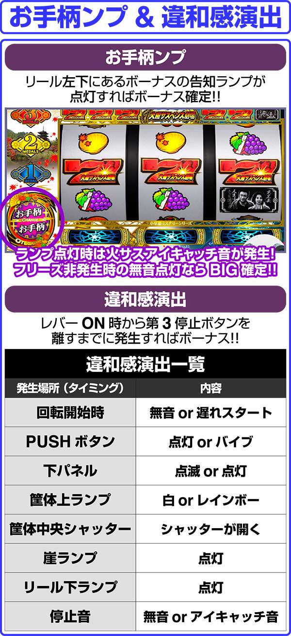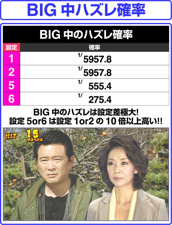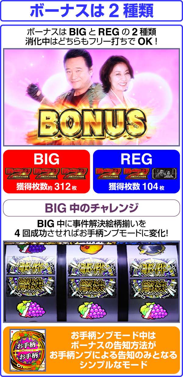 あの「火曜サスペンス劇場」がボーナス+RTタイプとして登場。 ボーナスはBIG、MIDDLEの2種類があり、BIG終了後にのみ32GのRTに突入する。 ボーナス当選のメイン契機はレバーON時に発生する「サスペンスフリーズ」。フリーズ後に画面が割れれば事件演出に発展、最終的に事件演出をクリアできればボーナス確定となる。 また、全リール停止時などに「お手柄ンプ」が点灯する告知パターンも存在する。 |