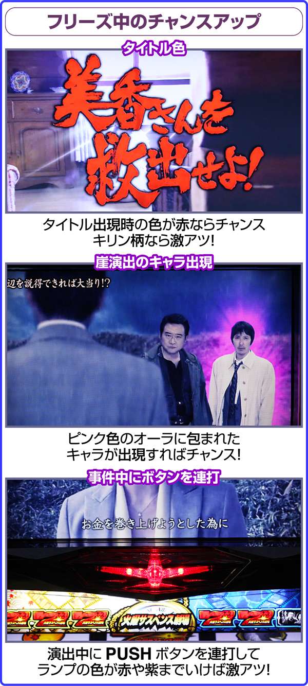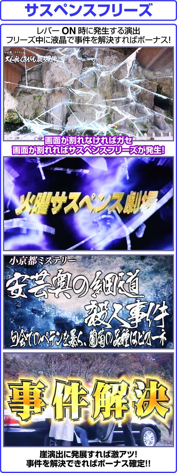 レバーON時に発生するサスペンスフリーズは、リールロック+液晶のヒビ割れが合図となっており、画面が割れれば事件発生となる。発展後は下位演出と崖演出のどちらかに発展し、崖演出なら激アツ。