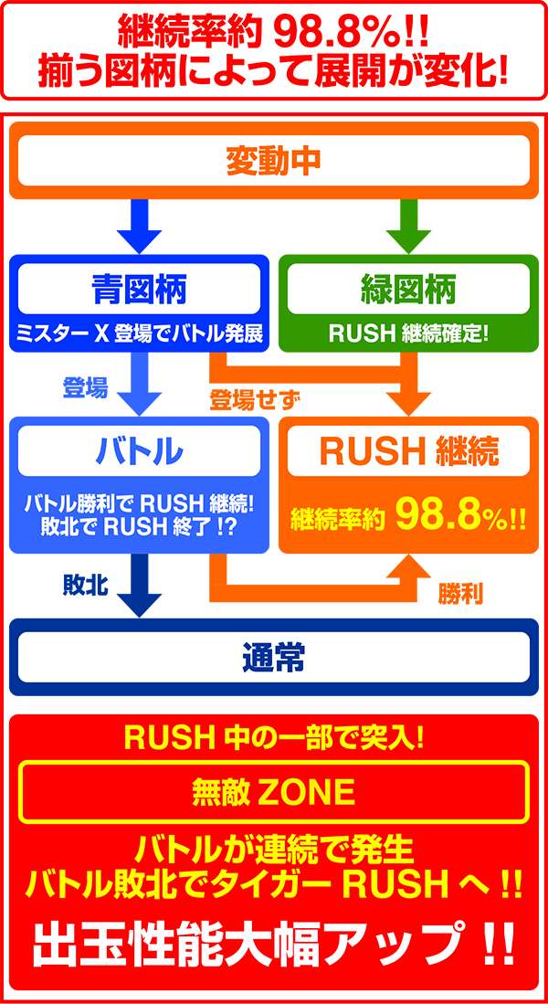 | タイガーラッシュ突入 | 約50%(ヘソ)98.8%(電チュー) |