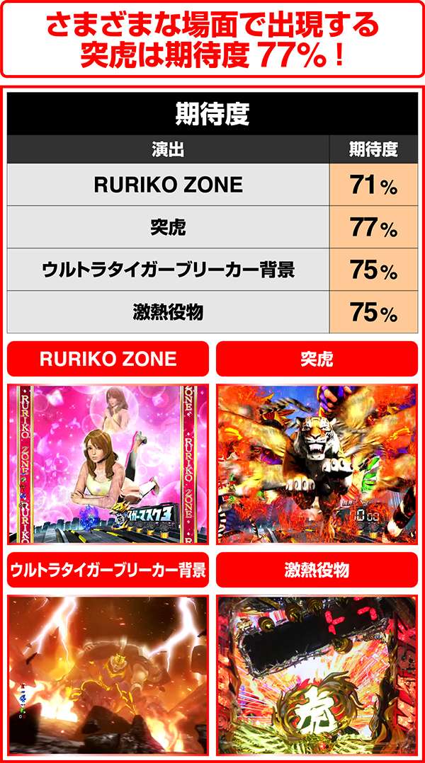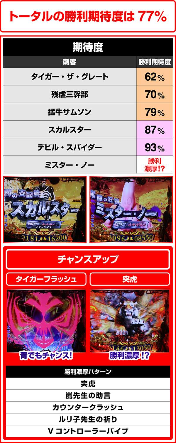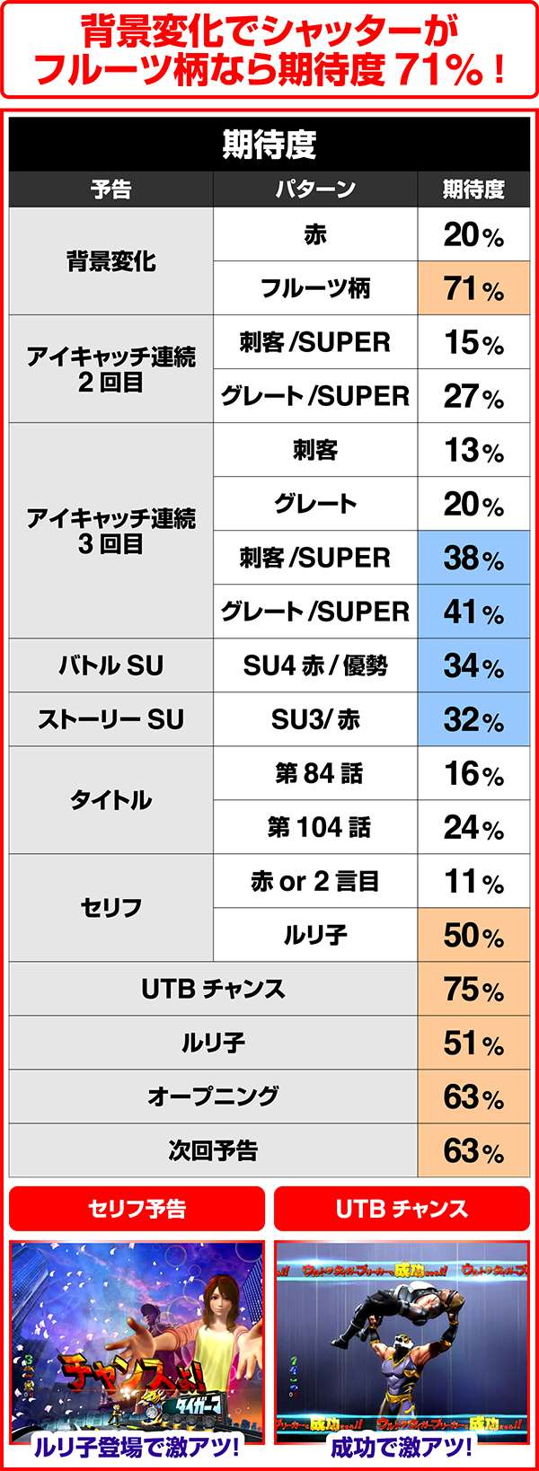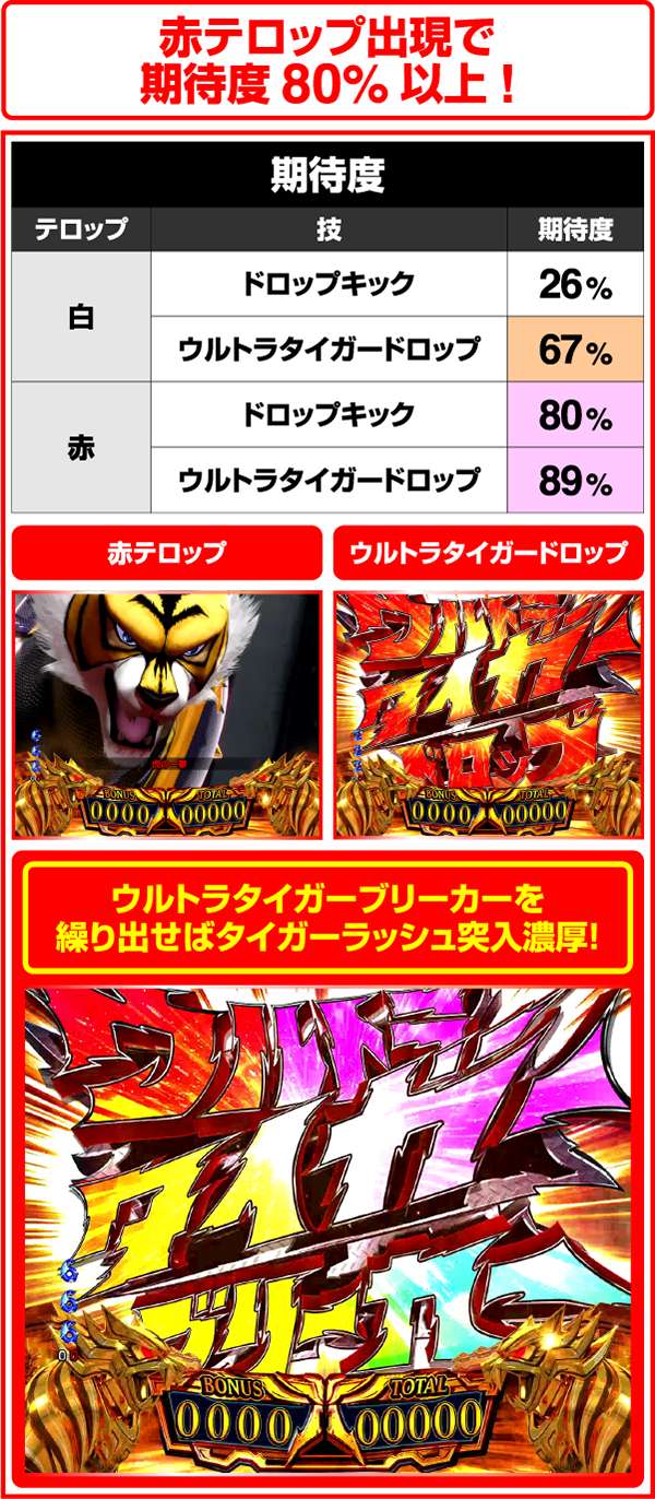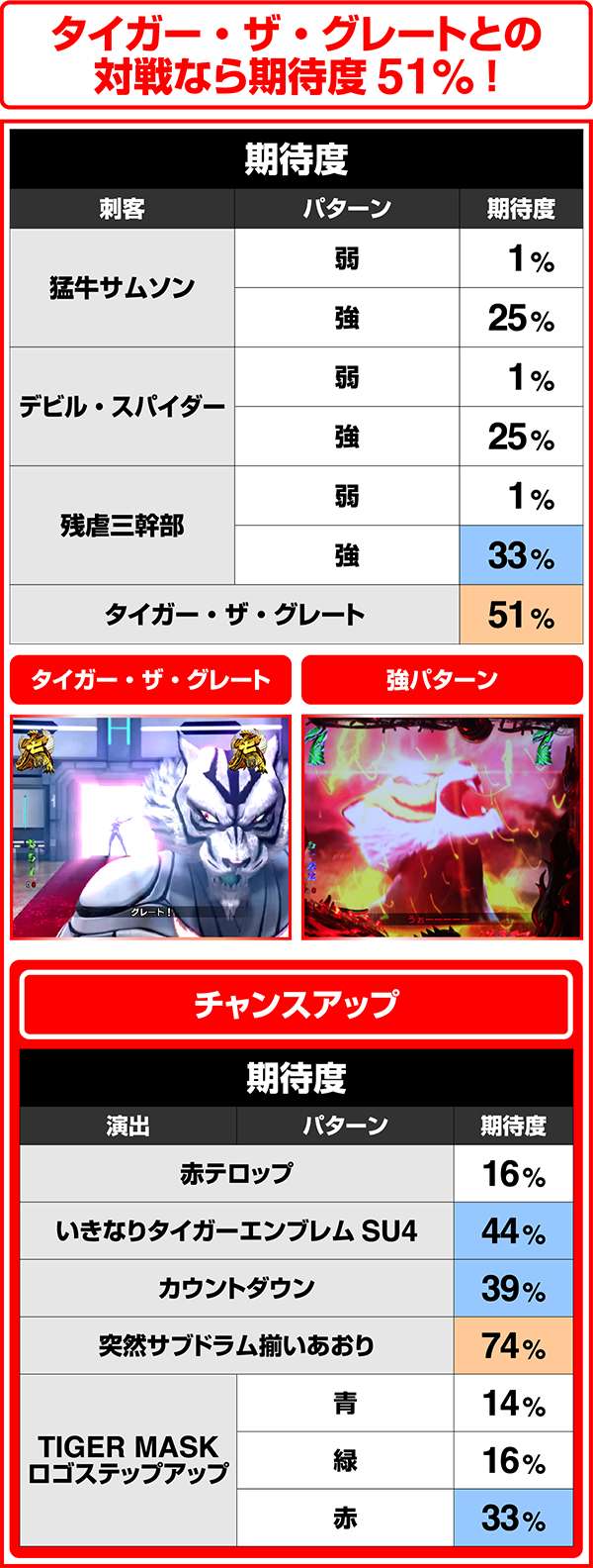 ほかには、バトルリーチと共通のチャンスアップとなる赤テロップ、いきなりタイガーエンブレムSU4、TIGER MASKロゴステップアップも注目だ。