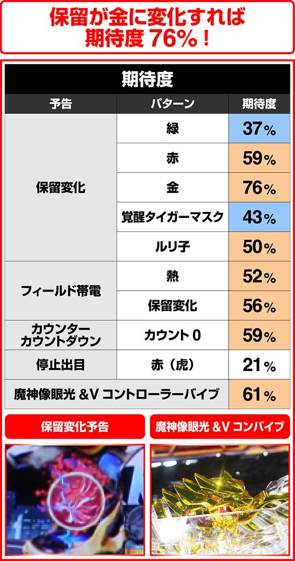 保留は色が変化すれば、緑でも期待度37%と大チャンス。アイコンは覚醒タイガーマスクやルリ子に期待しよう。