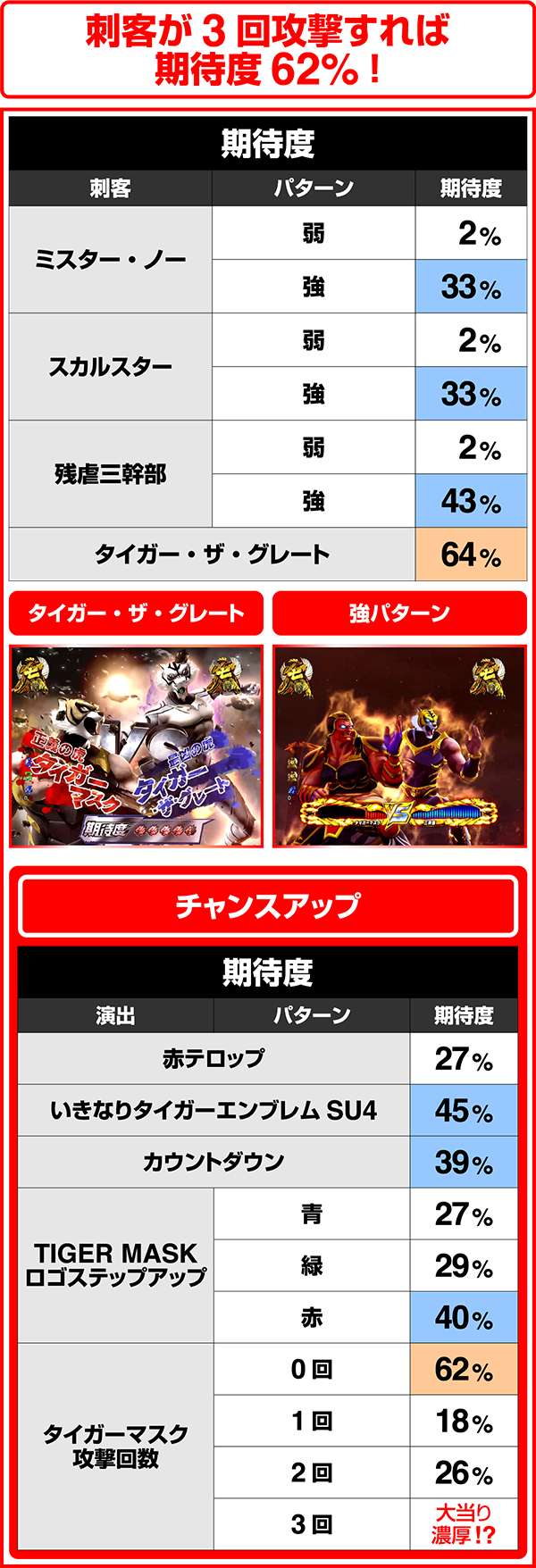 チャンスアップの攻撃回数はタイガーマスクが2回攻撃or刺客が3回攻撃ならチャンス。