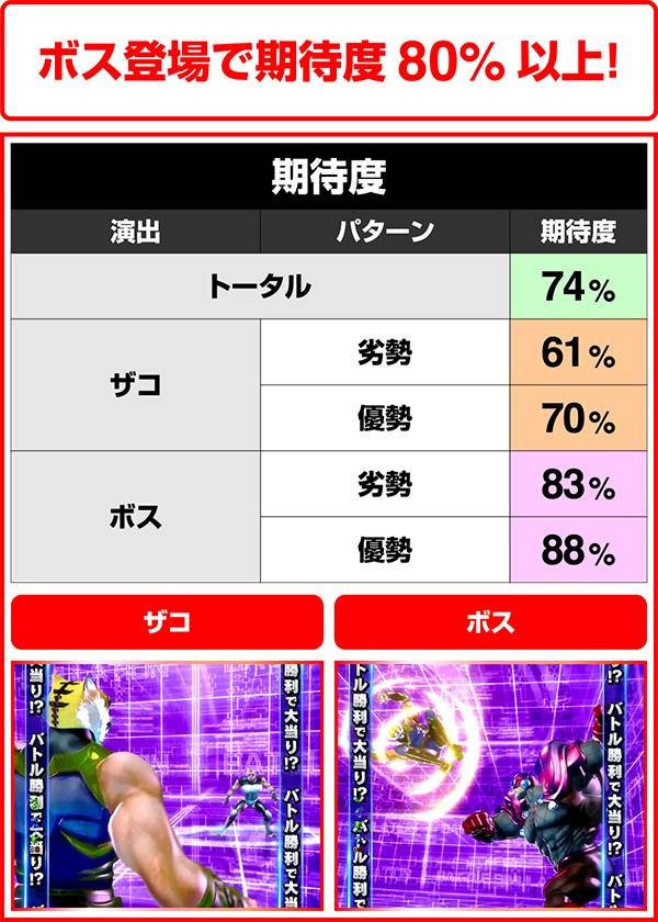1番弱いパターンでも期待度は61%と大チャンス。ボスが登場すれば激アツ必至!