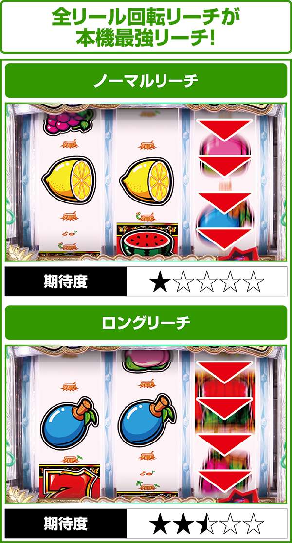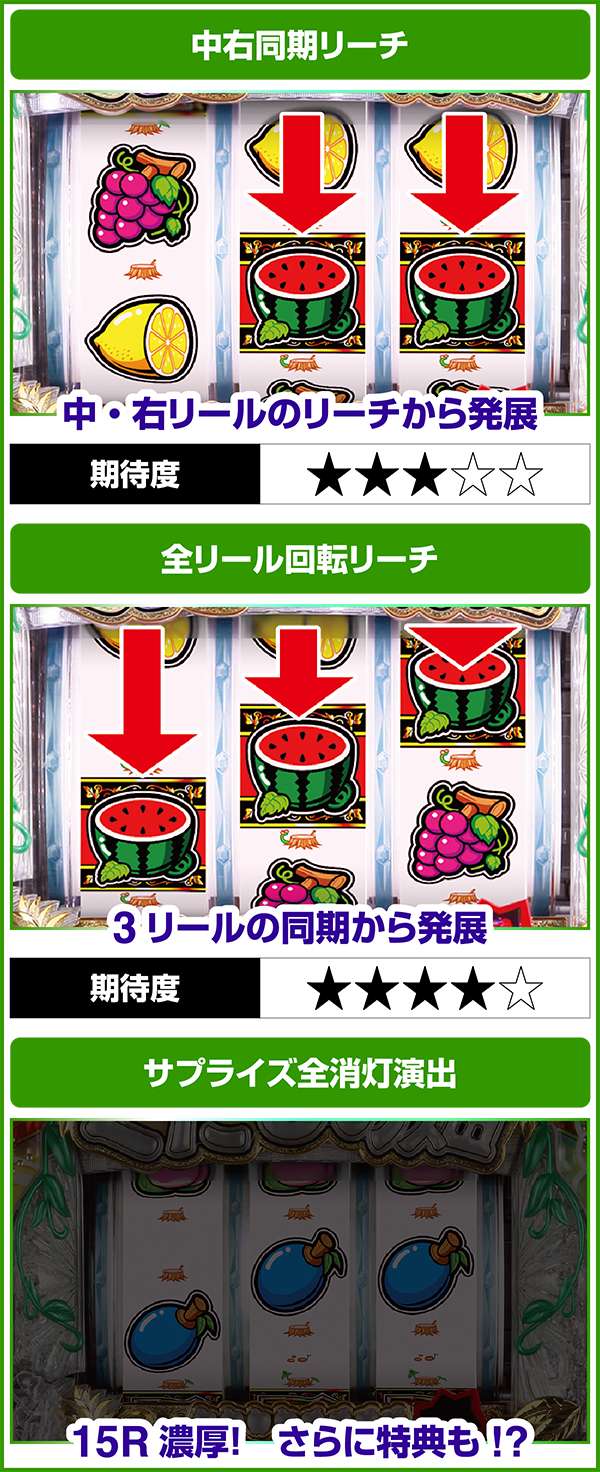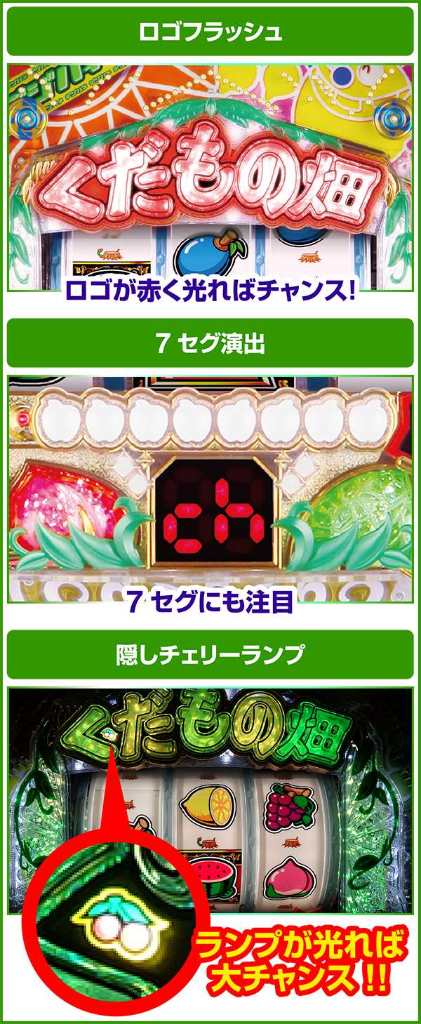 シンプルで親しみやすいドラム演出で「くだもの畑」が21年の時を経て復活! 大当り後は必ずST10回転+時短30回転の電サポ40回転が付く、オーソドックスなスペック。 初代のリールアクションを再現し、新しい楽しさを追加した演出はオールドファン垂涎のデキ。予告演出を完全カットする「クラシックモード」を搭載し、好みに合わせてゲーム性を選択できることもポイントだ。 |