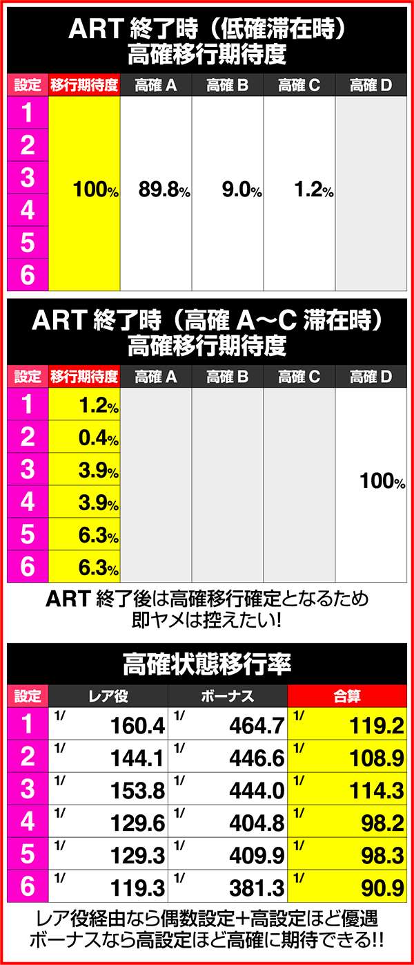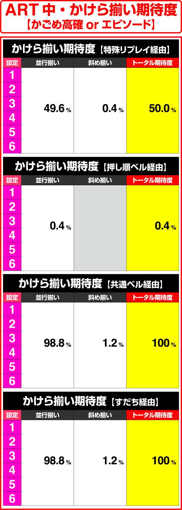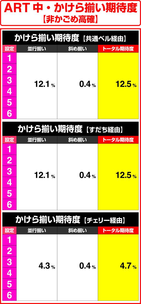 ART中の非かごめ高確中はチャンス目経由のかけら揃いがなく、ボーナス重複時のレア役のみかけら揃い期待度が高い。非かごめ高確中のかけら揃い確率は低いが、設定1と設定6で大きな設定差がある。
